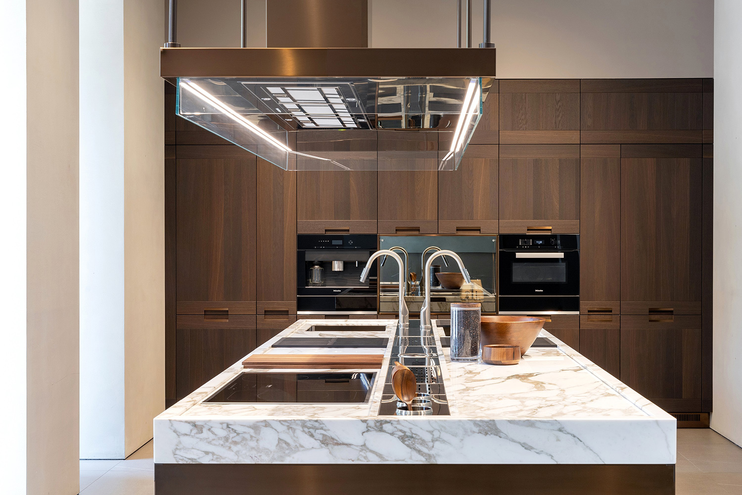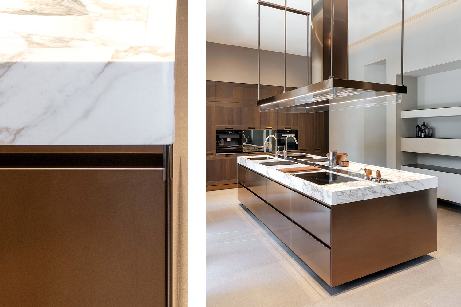 CONVIVIUM + PRINCIPIA In the window, Convivium island with doors in bronze PVD stainless steel, worktop in 2 cm thick Calacatta gold marble with double drip guard and central accessorised channel, New Convivium hood in bronze PVD. Behind it, a wall of tall units with Principia door in NTF fumé oak, Principia integrated handle in bronze PVD stainless steel, double oven, fridge, freezer, and, in the centre, the Mac (Mini-Appliances-Container), the functional unit for storage and use of small electrical appliances.