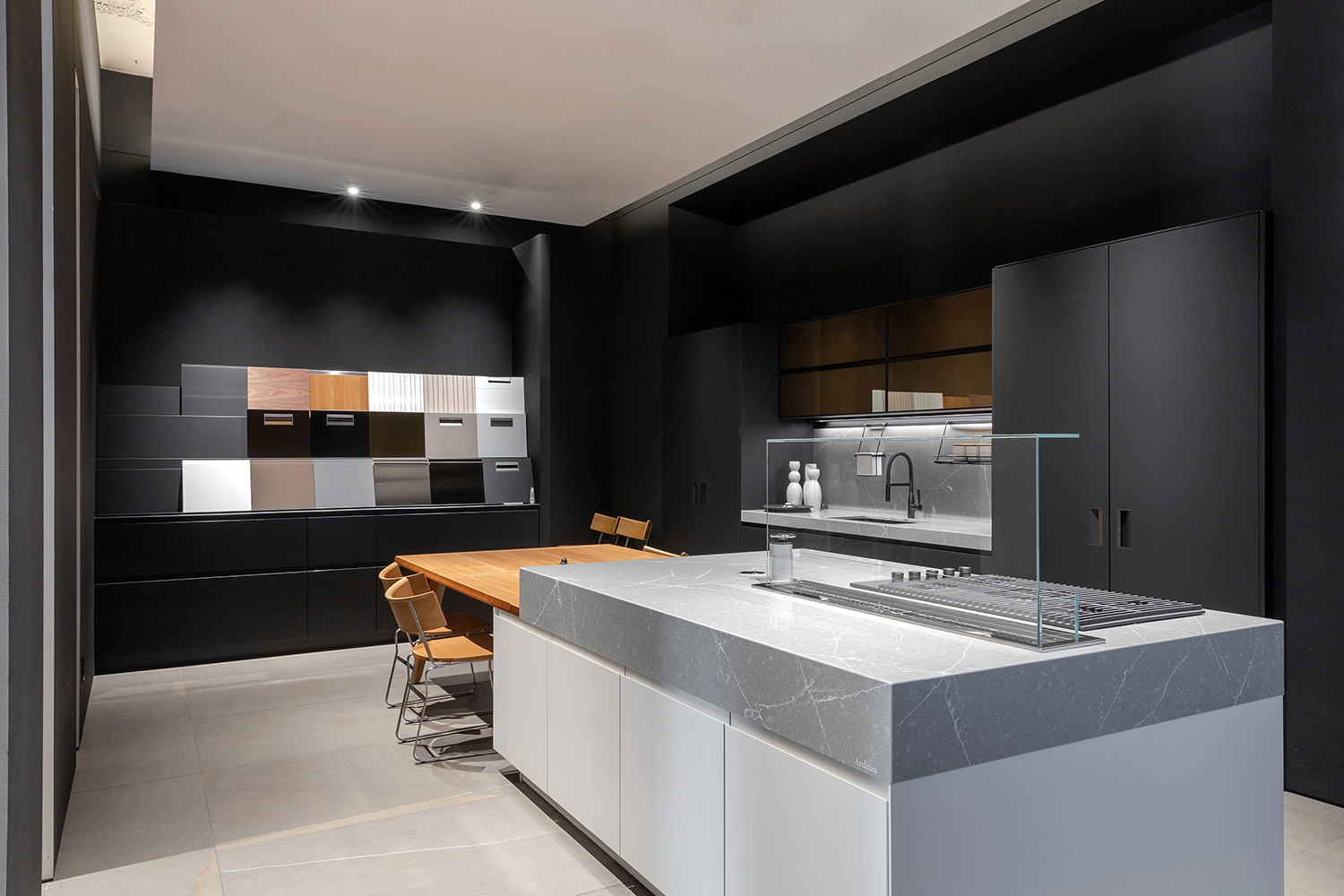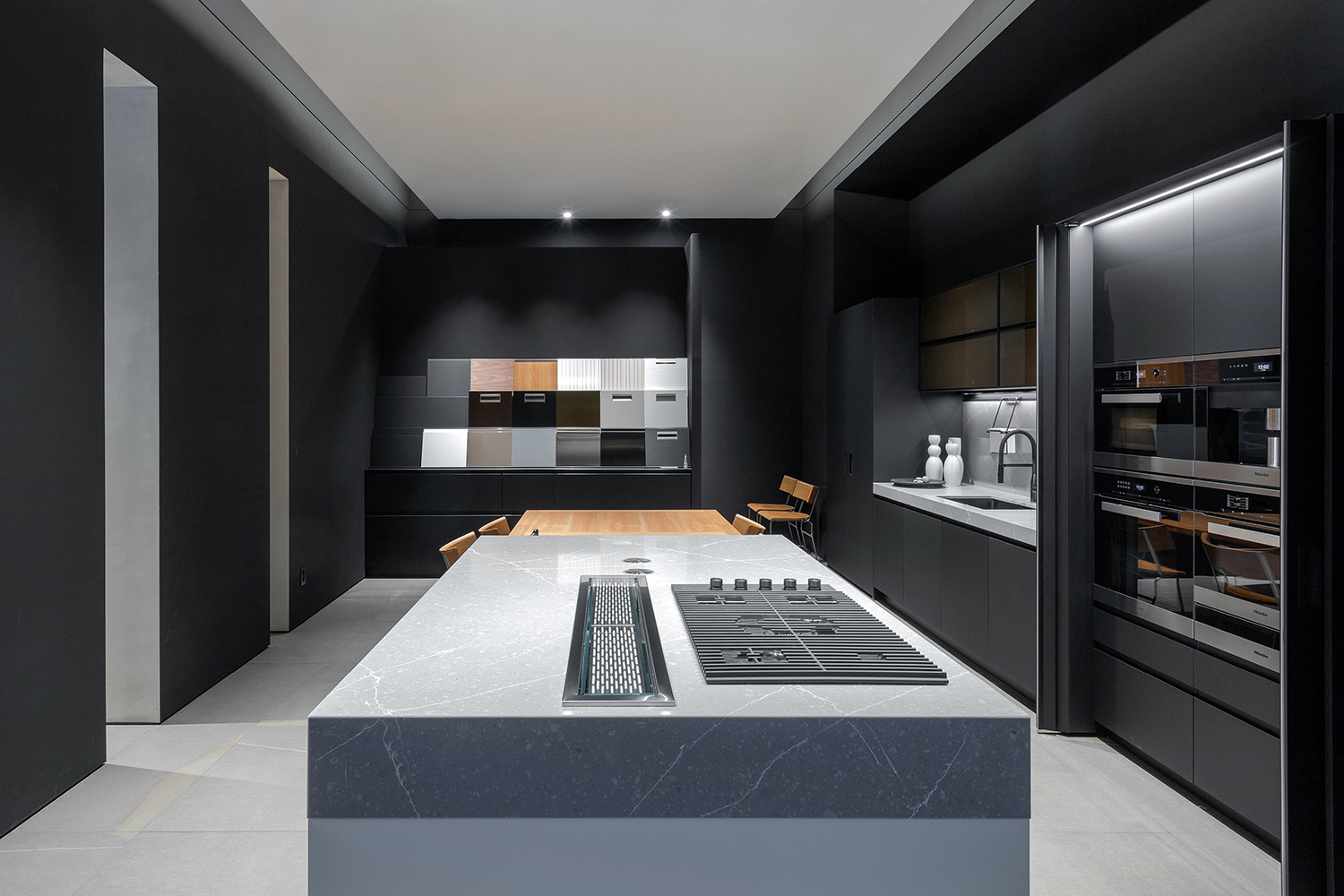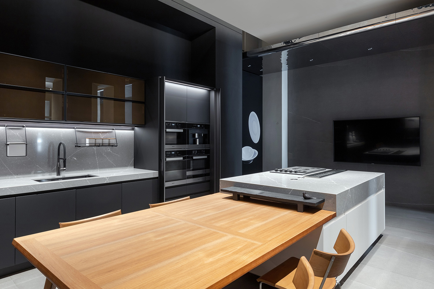 CONVIVIUM + ITALIA Convivium socialising island with Convivium Elegant doors in matt lacquered bianco conchiglia, 20 cm thick worktop in Quarzo Tech Mercury, Arclinea 5-burner hob with cast iron pan supports, Hide hood for top and built-in Era table in teak. Working wall with Italia door in black Fenix NTM and dark silver handle, washing zone, worktop and back panel in Quarzo Tech Mercury, rail with 3000K LED lighting profile, wire accessories and horizontal wall units in glass. New Pocket System disappearing doors hide the storage space with 4 ovens. At the back, the display wall with the finishes in the Arclinea Collection.