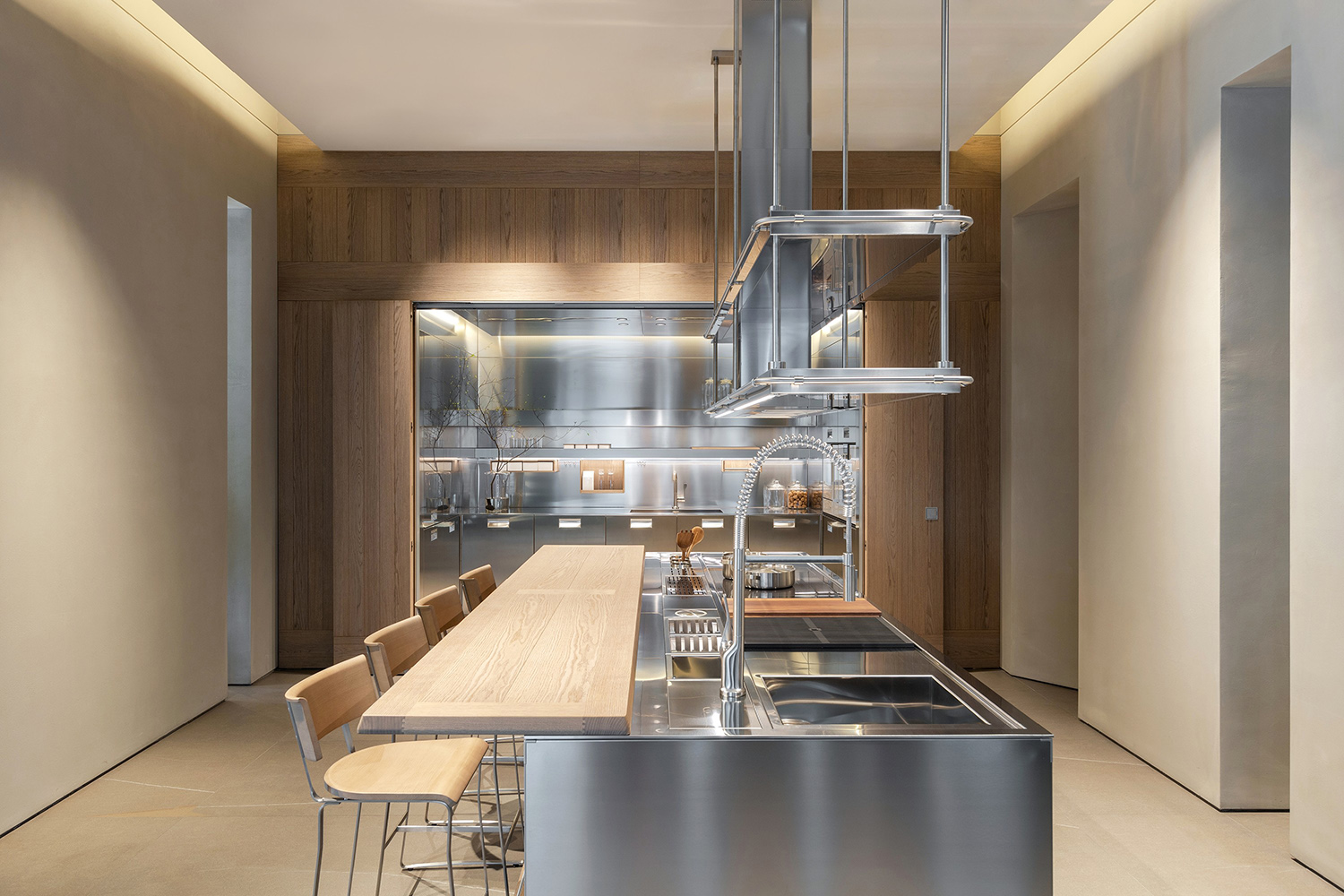 ITALIA + MODUS A project that organises the kitchen into two different spaces joined by their functions, with socialising Italia island in stainless steel and Era Snack Bar in NTF fossil oak, Double Shelf with integrated hood and wood panelled wall in NTF fossil oak, and built-in Modus System horizontal folding doors. Inside, Italia operational kitchen in stainless steel. Modus System doors open to reveal an inner space with Italia kitchen in stainless steel: central zone with sink, 12 cm thick worktop, back panel with Shelf Hood and Mensolinea Shelf complete with 3000K LED lighting profile. To either side, walls of tall units housing fridge and freezer on the left and double ovens on the right.