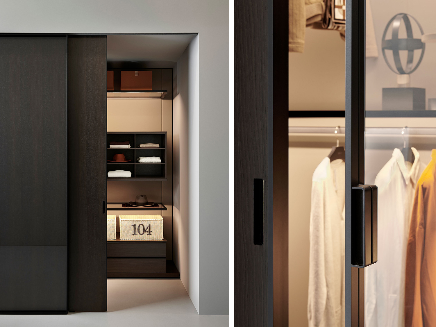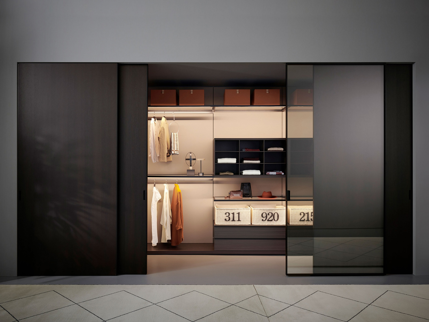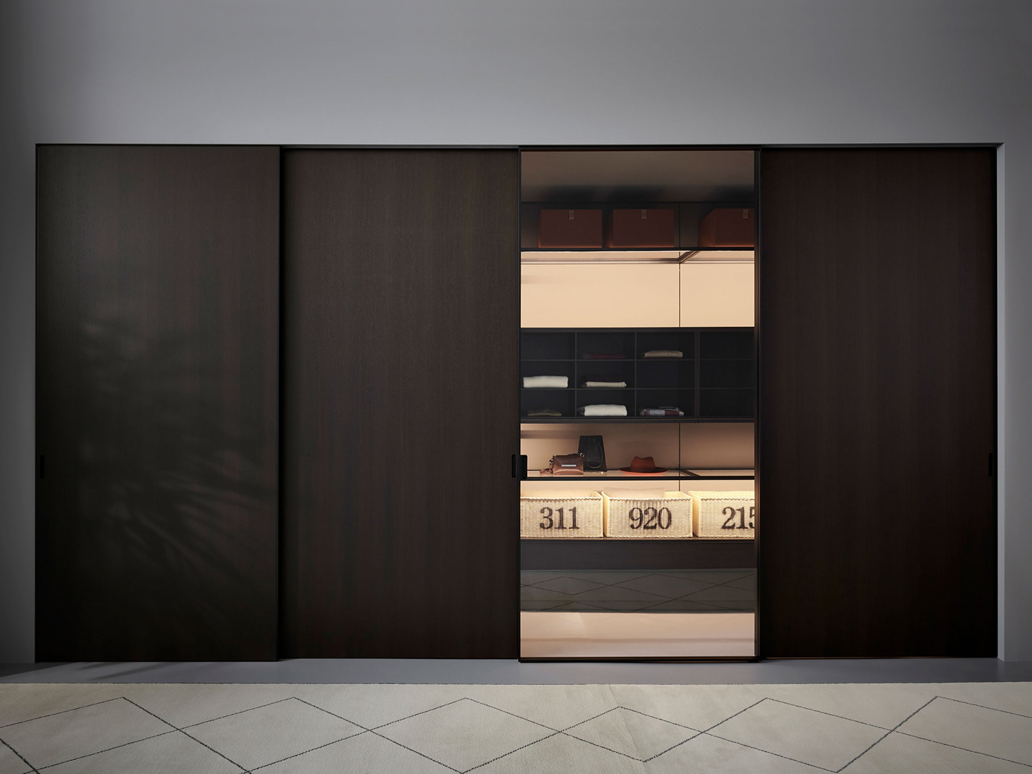 Porro’s spaces are created and connected by the new Glide sliding doors, large custom-made wings characterized by a metal L-shaped profile that provides a frame to various transparent and non-transparent materials. Thanks to the upper rail, the Glide doors offer different solutions to choose from or to combine together in evocative overlaps. With their clean yet materially rich design, Glide doors integrate perfectly into the Storage closet project, lightly defining a new architecture of space where traditional spaces are expanded and reshaped in a new way.