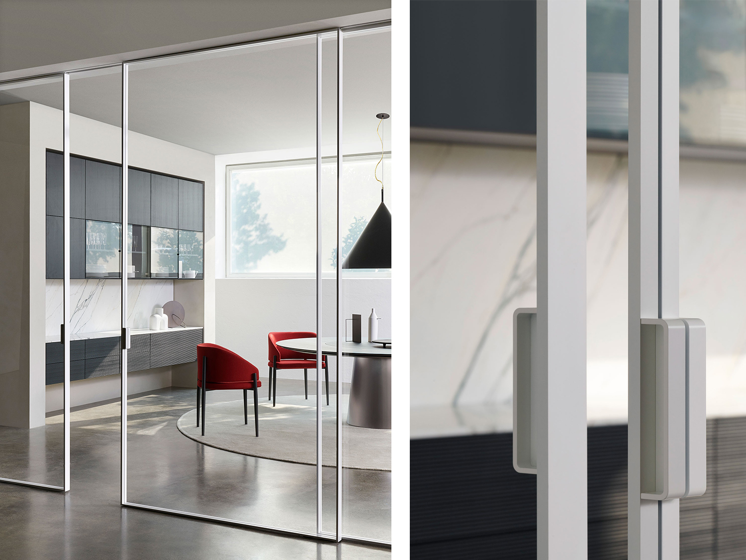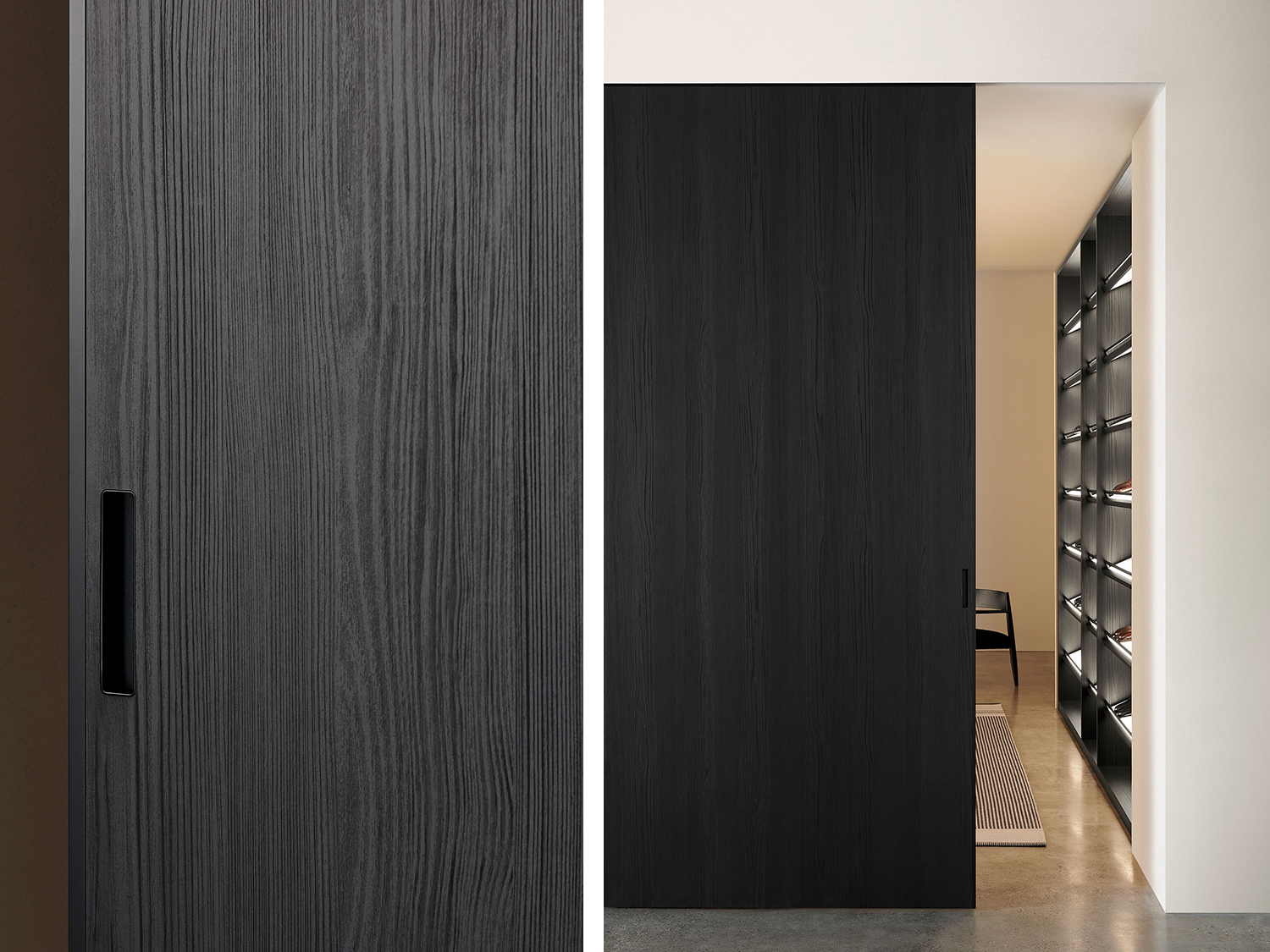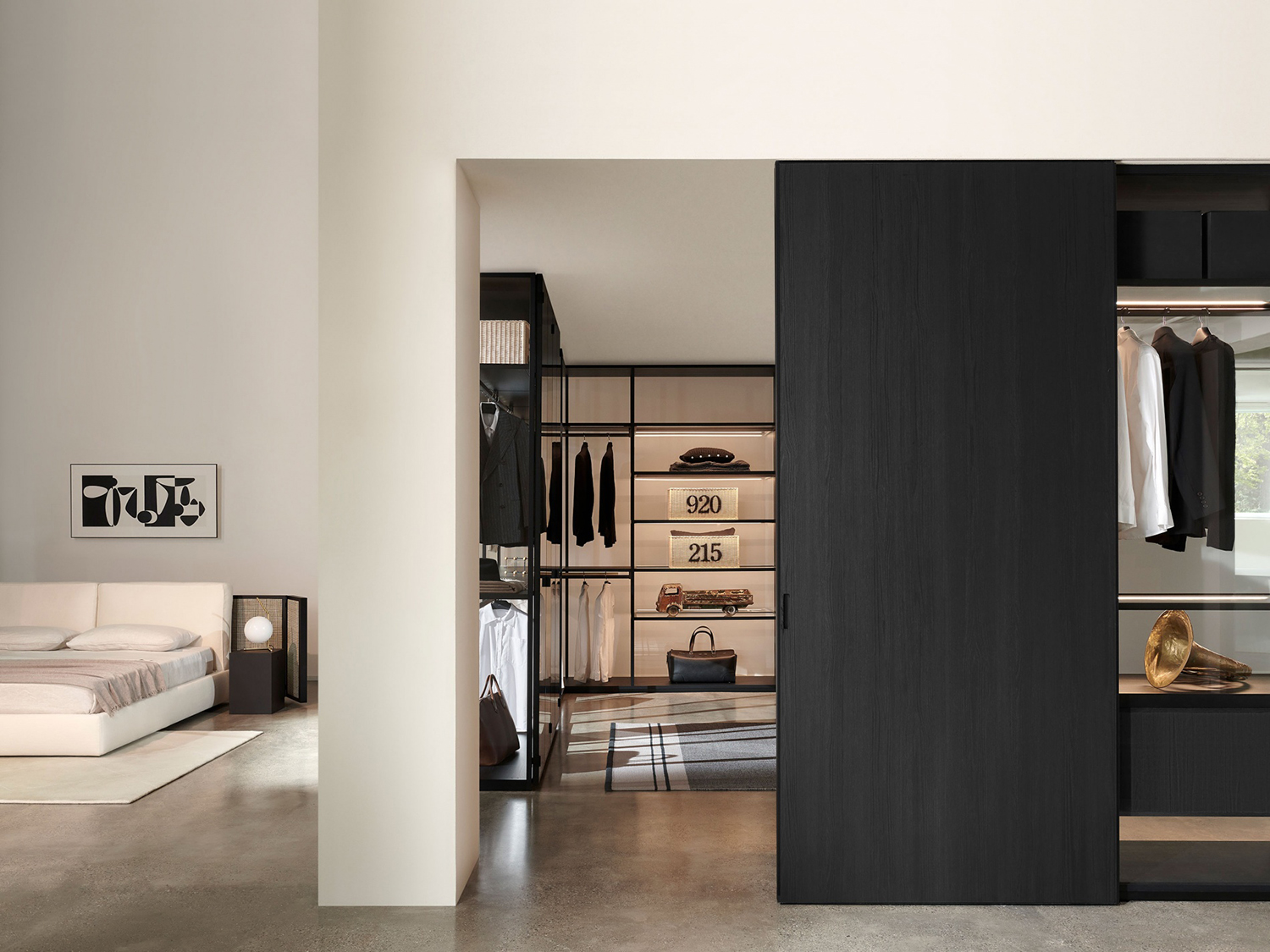 Porro’s spaces are created and connected by the new Glide sliding doors, large custom-made wings characterized by a metal L-shaped profile that provides a frame to various transparent and non-transparent materials. Thanks to the upper rail, the Glide doors offer different solutions to choose from or to combine together in evocative overlaps. With their clean yet materially rich design, Glide doors integrate perfectly into the Storage closet project, lightly defining a new architecture of space where traditional spaces are expanded and reshaped in a new way.