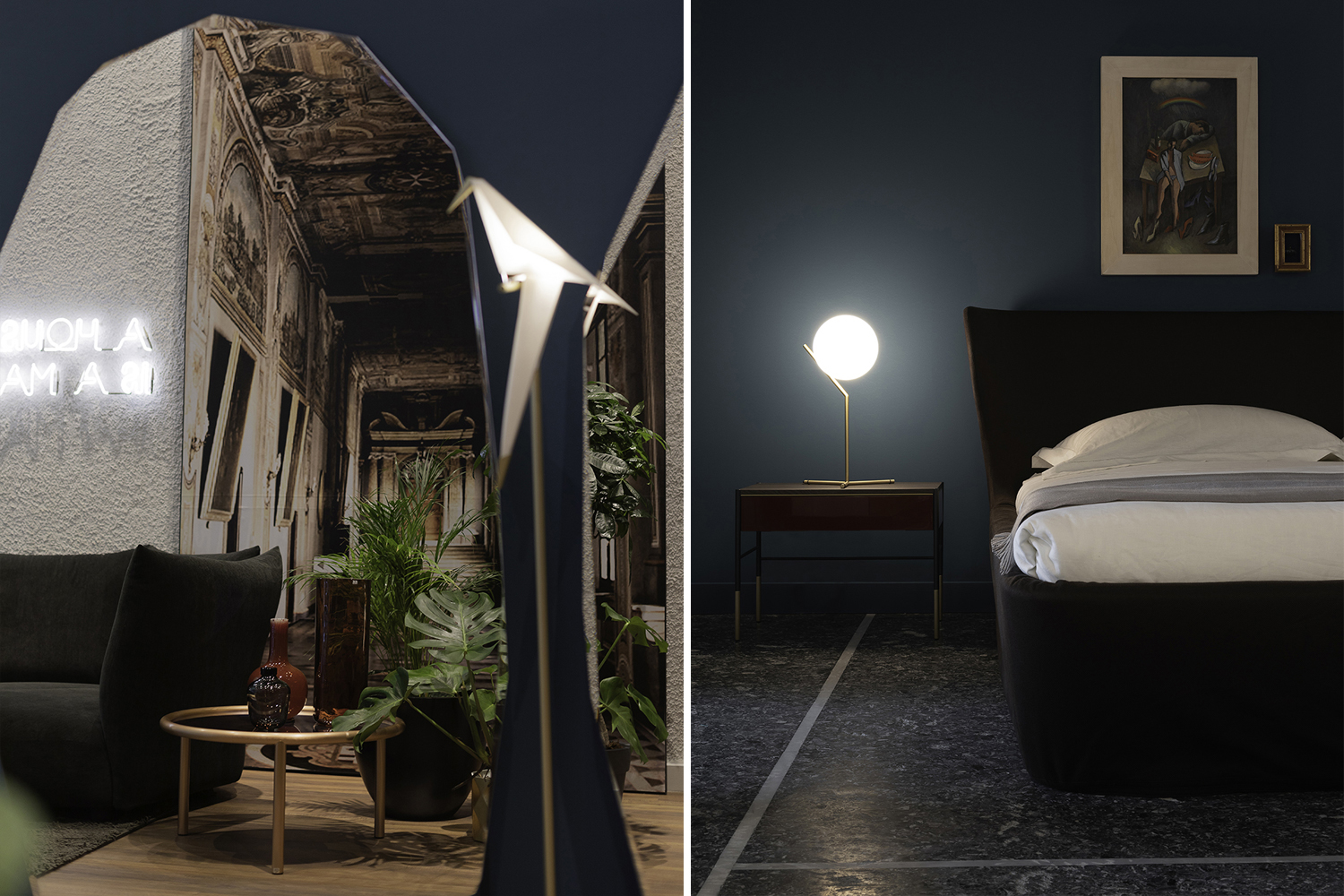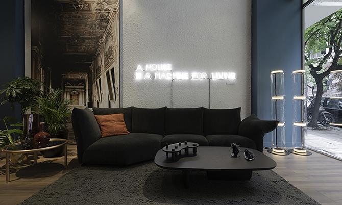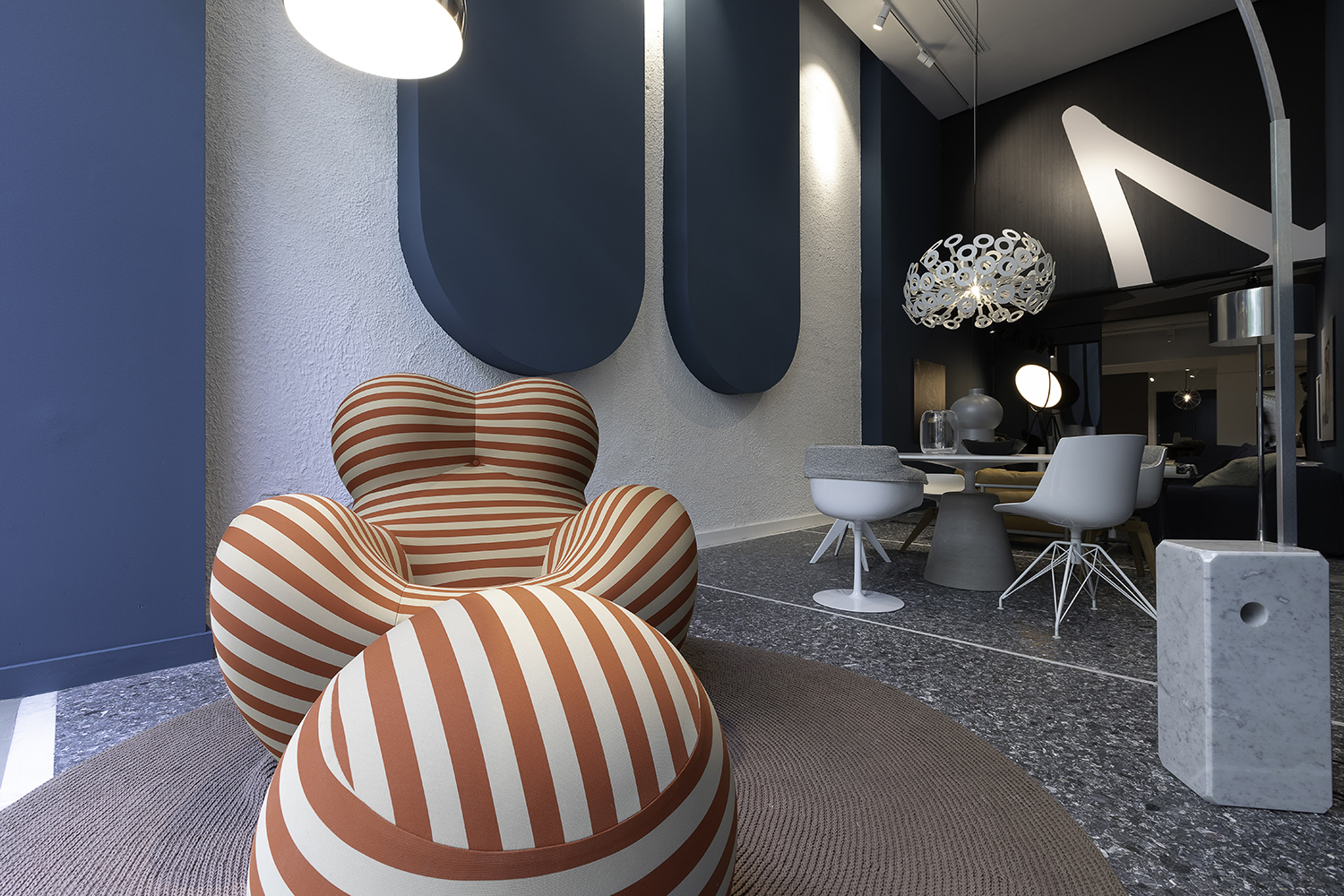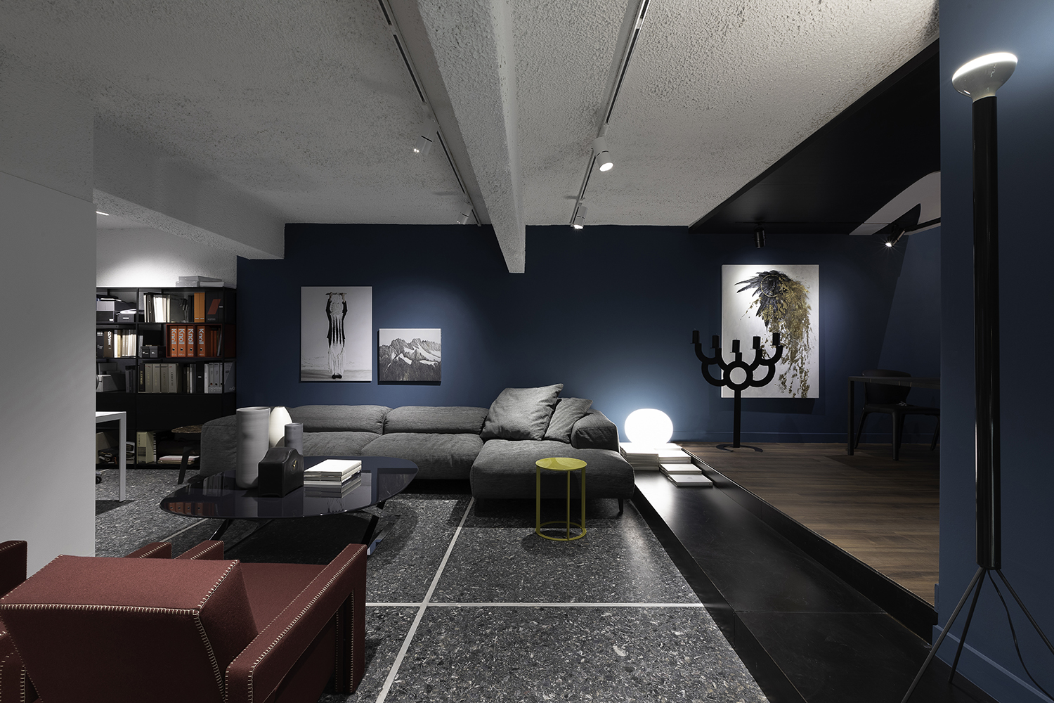Great thought has been given to the innovative techniques employed on the walls and beams. A variety of unique colors and textures, a dominance of strong blues together with neutrals, provide a stunning backdrop for a collection of furniture and accessories by a range of global brands including B&B Italia, Cassina, Edra and Knoll. In addition, the lighting brand Flos has its own shop in shop under the same roof, providing a comprehensive range taken from its latest collections, together with the classic designs of the brand.