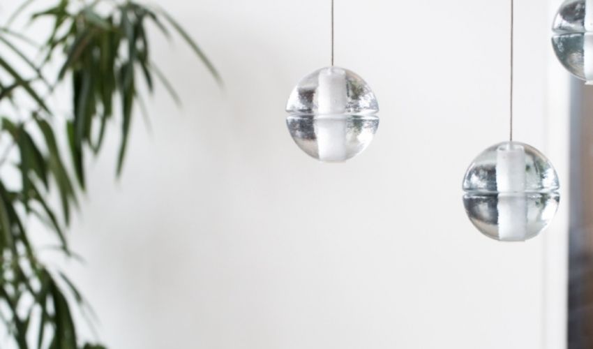 14 is an articulated, cast glass sphere with a frosted cylindrical void that houses either a low-voltage xenon or LED lamp. Individual pendants are visually subtle, but gain an atmospheric quality when multiplied and clustered in groups.