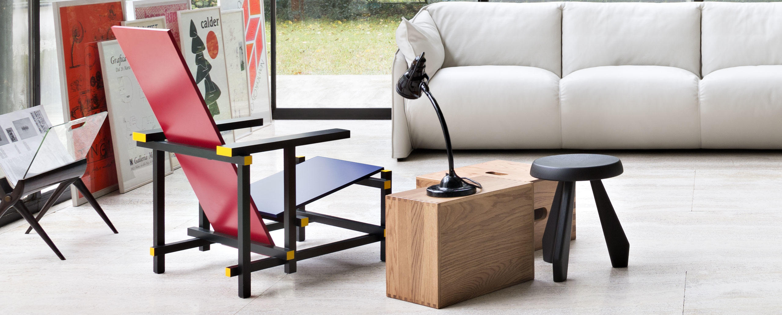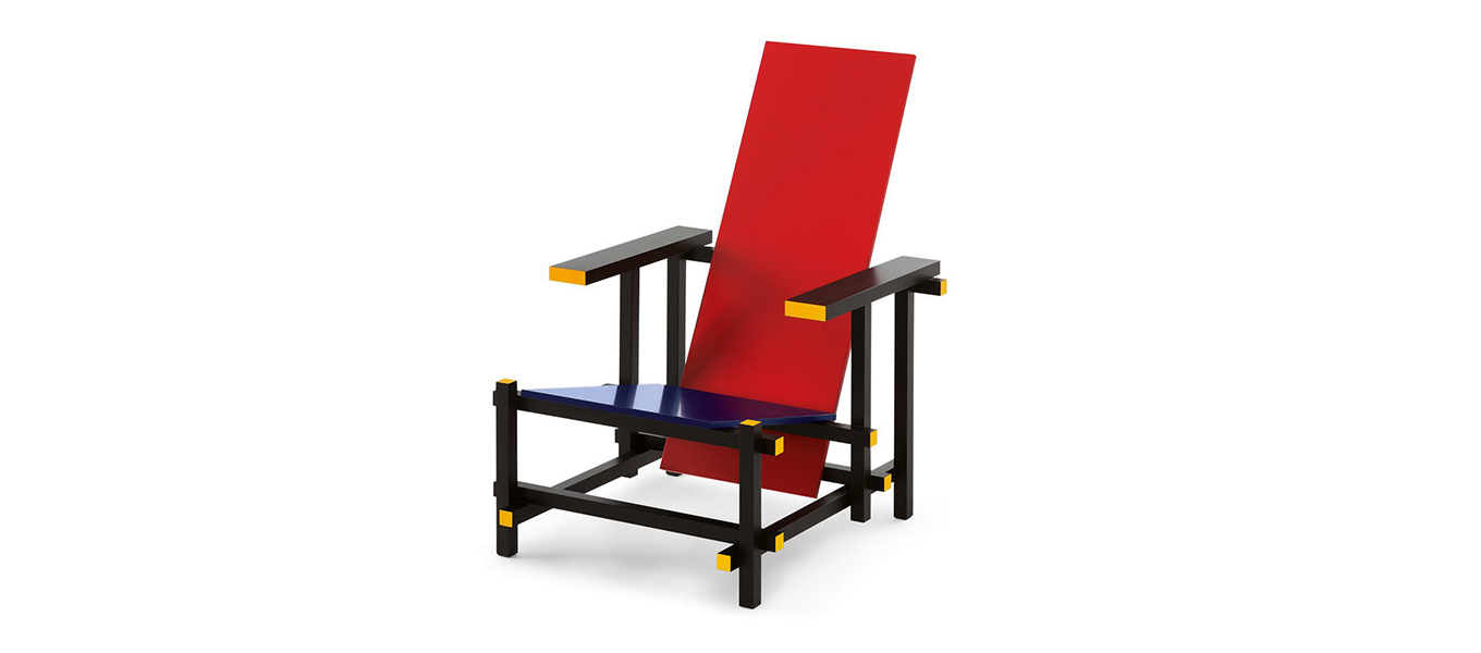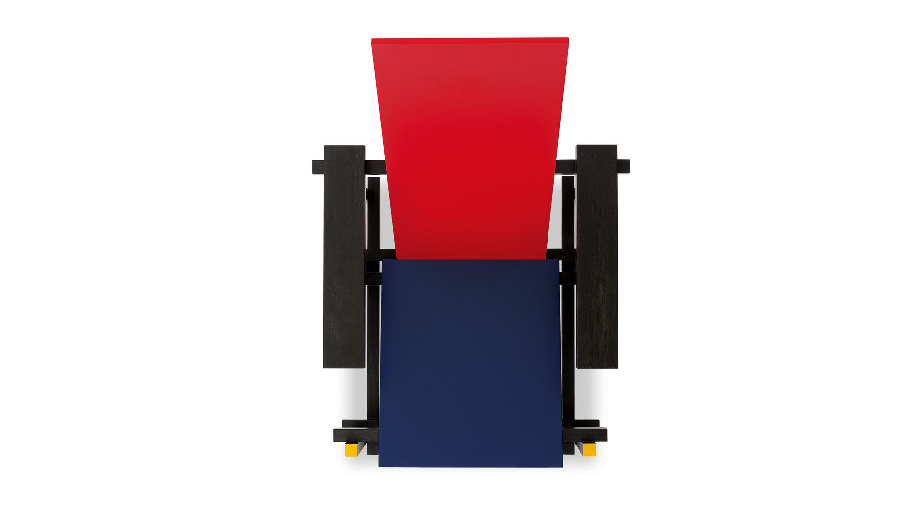 A sculptural seat with a pure and rationalist form, this chair became an authentic Manifesto for Neoplasticism, embraced by the Dutch De Stijl movement in 1917. An outlook shared by Piet Mondrian, whose objective was to seek out the essential nature of things, combined with the harmonious equivalence of colours, and the use of right-angle. Rietveld produced his first prototypes in 1918, expressing the philosophy of organising space using the same colours for similar components. He later applied this same approach to separate out constructional elements according to their function. Thus the base was black, and the seats coloured. As a consequence, the name of the piece changed, from Slat Chair to Red and Blue.