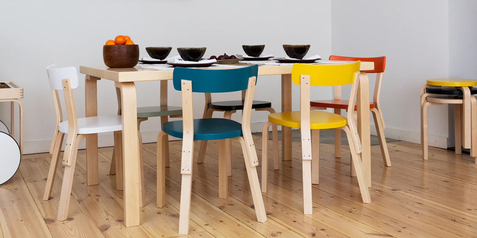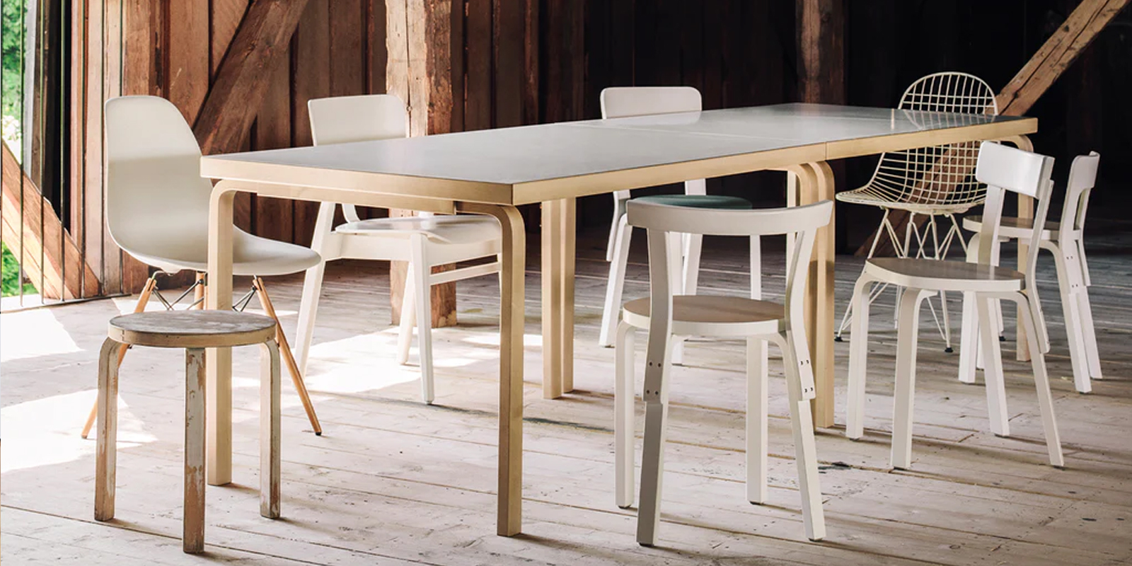 The Aalto Table conveys a relaxed familiarity that resists categorisation. With legs and edge-bands of Finnish birch, it radiates natural beauty and warmth, moving easily between public and private spheres in accordance with Alvar Aalto’s conception of versatile furniture. The top is available in birch, linoleum, or laminate, materials that age gracefully over time and last across generations. All-natural linoleum offers the ideal surface for writing, while easy-to-clean laminate provides a slightly more robust option. Whether used for dining, working, or playing, the table retains its character while offering endless possibilities.
