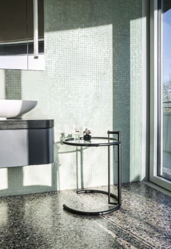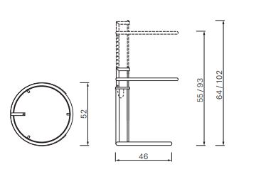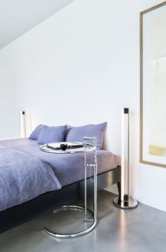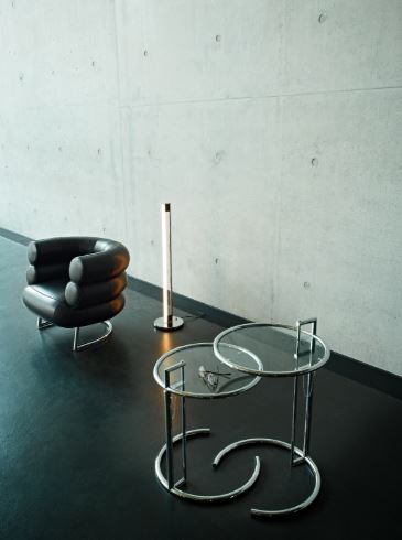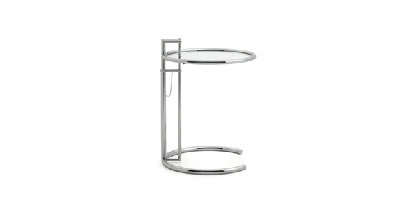This is perhaps the classic among the classics. Its ingeniously proportioned, distinctive form has made this height-adjustable table one of the most popular design icons of the 20th century. It is named after the summer house E 1027 “Maison en bord de mer” that Eileen Gray built for herself and for her collaborator, Jean Badovici. The secret code-name likewise comes from her: E is for Eileen, 10 for Jean (J is the 10th letter of the alphabet), 2 for B(adovici) and 7 for G(ray). Side table. Height-adjustable base, powder-coated tubular steel in black or chrome-plated. Tabletop clear crystal glass