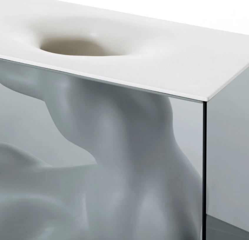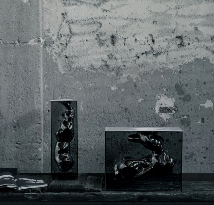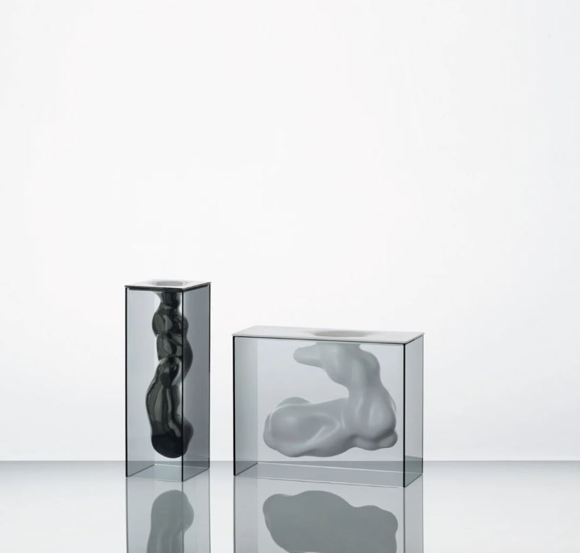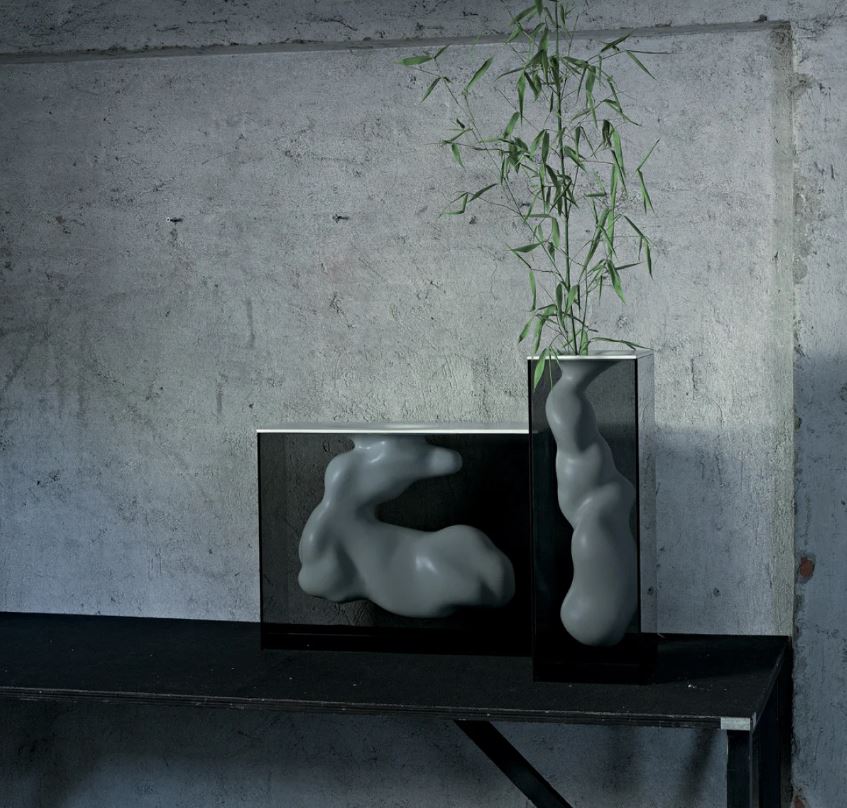 A series of vases composed by a parallelepiped shaped case, realized in smoked glass, glued 45°, and an organic shaped ceramic sculpture, supported and contained in its inside. The ceramic element, available in the finishes opaque white or platinum lacquered, is hollow and can contain water. Available in two different shapes and sizes.