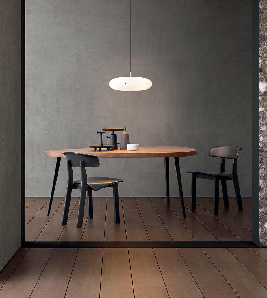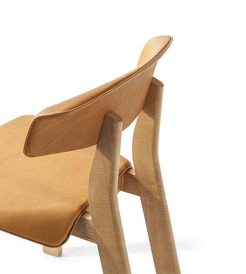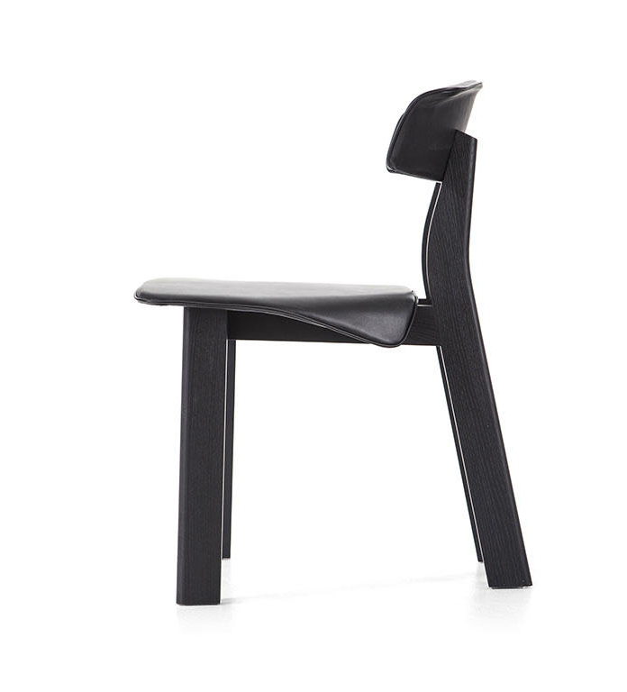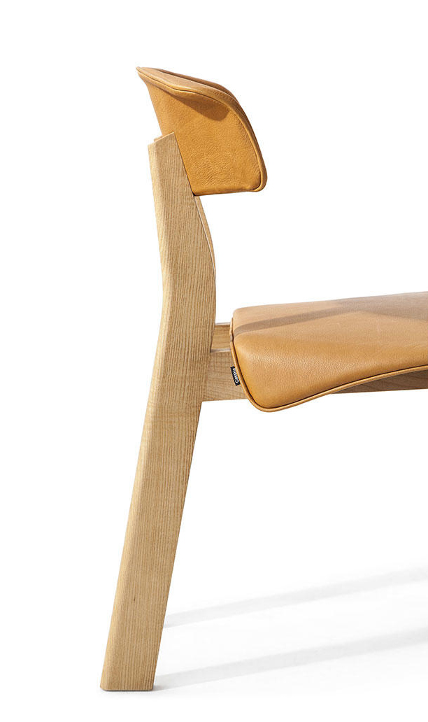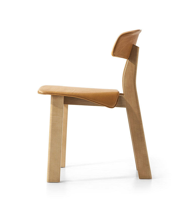 The furniture-making skills known as MedaMade, a trade mark patented by Cassina, is made manifest in a new chair that, leaving classical stereotypes behind, sparks off powerful new idioms. The frame, in solid ashwood, consists of basic big, bold legs and cross-pieces with a solid and energetic look. The innovative nature of this chair springs from the contrast between the strong lines of the frame and the slender, understated covers, draped like a sheet of paper, conveying a striking sense of movement. The ergonomically-correct angle of the back and the invisible upholstery augment the comfortable look of the chair, creating a wrap-around feel where the turned-down top of the back becomes the arm-rest. The overall look is enhanced thanks to the elegant finishing touches, no stitching in sight, and a delicate leather-trim delineating the edges of the back and seat.