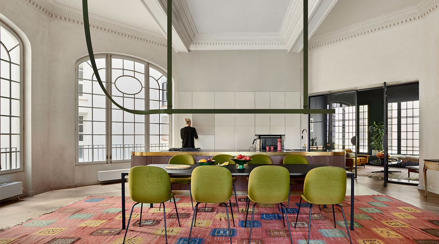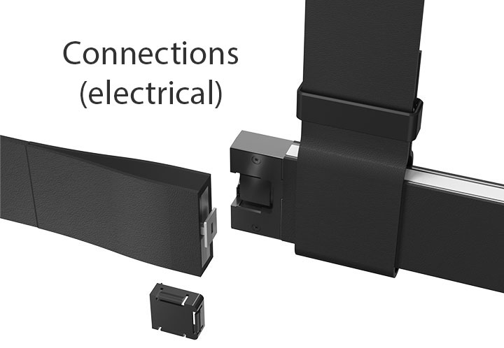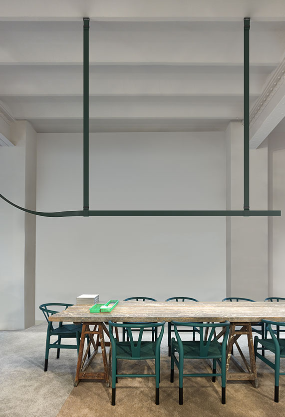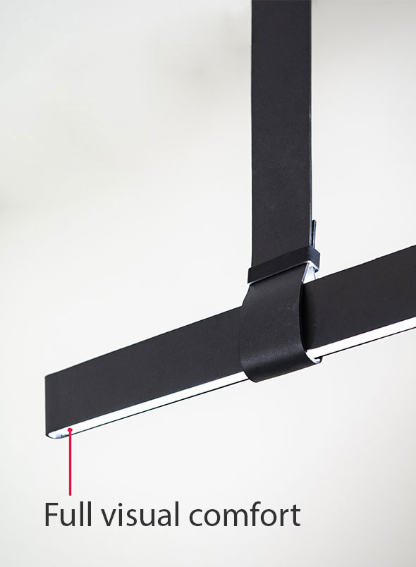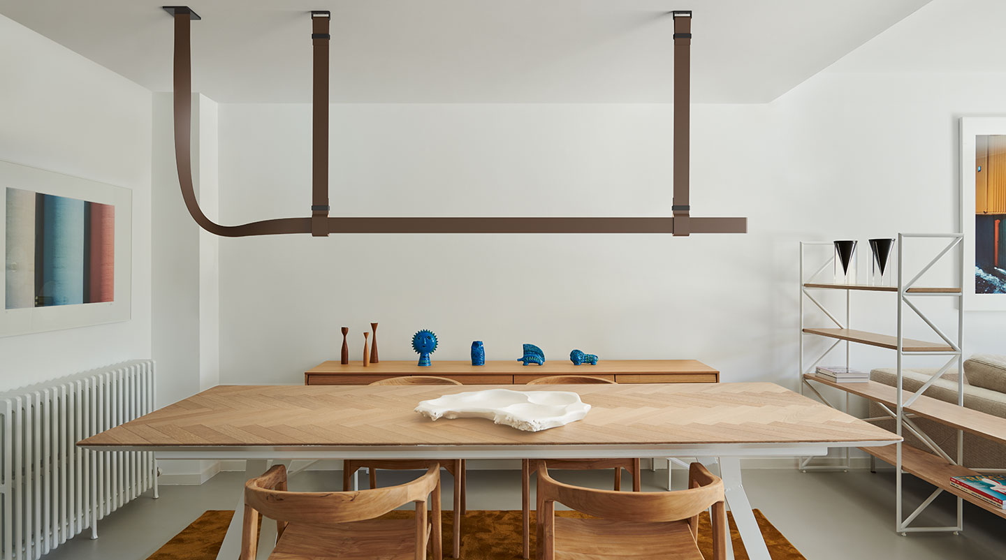 This iconic profile for suspended installation features a refined leather surface developed specifically for Flos . Belt is pure flexibility, a sinuous line that creates a balance between the softness of leather and the rigidity of aluminium. The soft part is represented by the connection to the electrical network, while the rigid parts correspond to the light source, the long lines of light. The fixture is equipped with integrated direct and indirect lighting and each light source can be controlled individually via remote control. The product is installed with the use of leather straps to hang the lighting profile, sliding the straps through dedicated metal clasps that act as hooks on the ceiling. Each strap may be regulated to match the shape of the environment. A special microconnector integrated into the terminal of the lighting profile allows for electrical connection through a simple snap. The electrical connection is hidden within the leather strap, which supports the composition. Profiles available in black, natural leather, and green finishes. Electrical system powered at 48V dimmable with CASAMBI controller integrated inside the fixture. To manage the system it is necessary to download the FLOS Control® powered by Casambi app (available on Apple Store and Google Play).