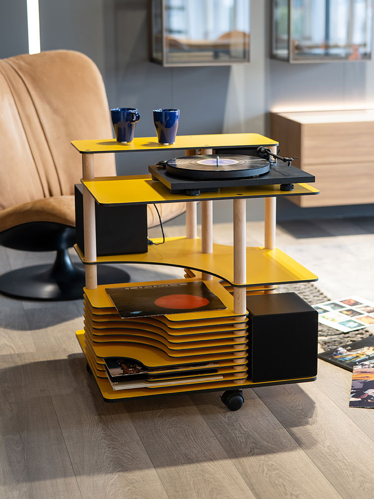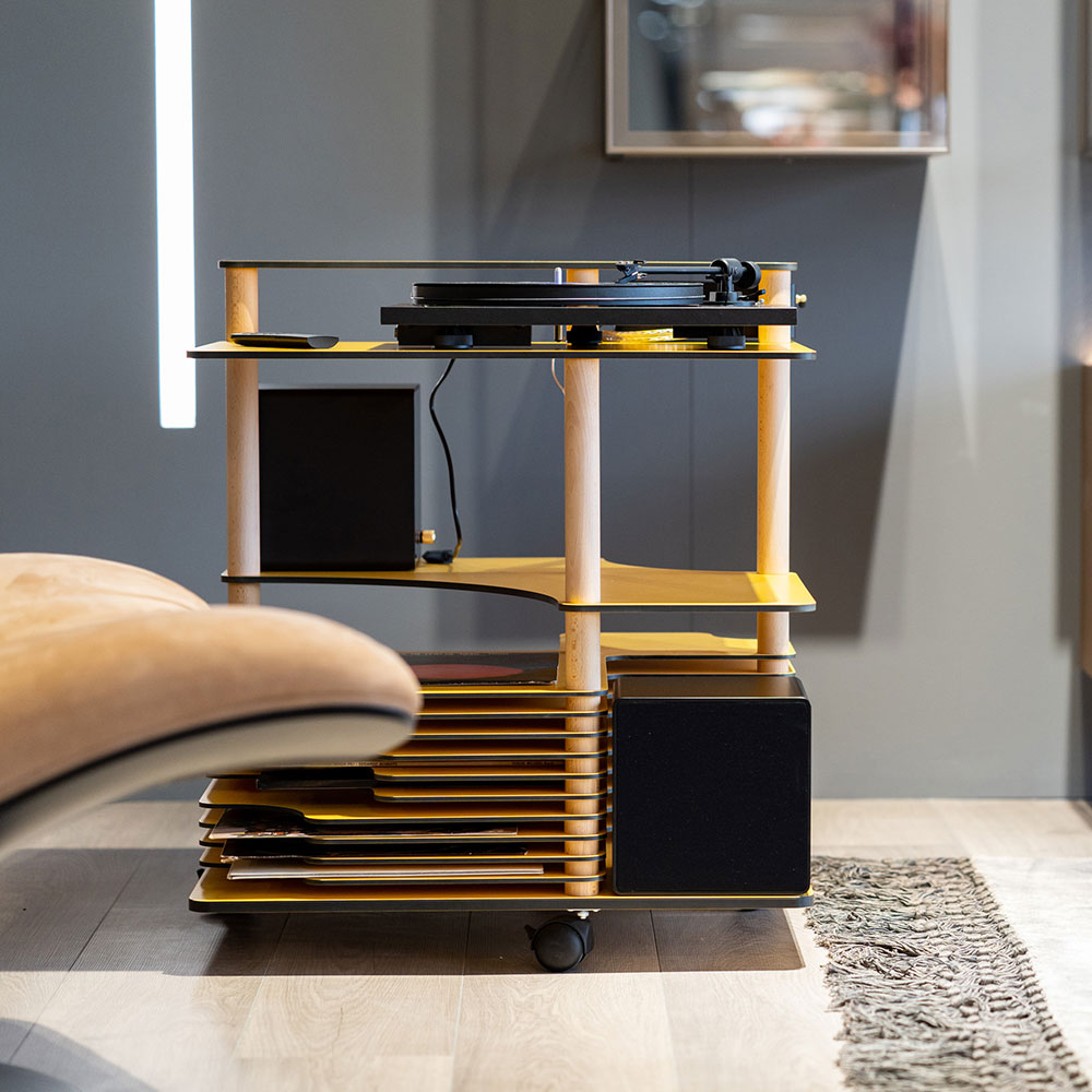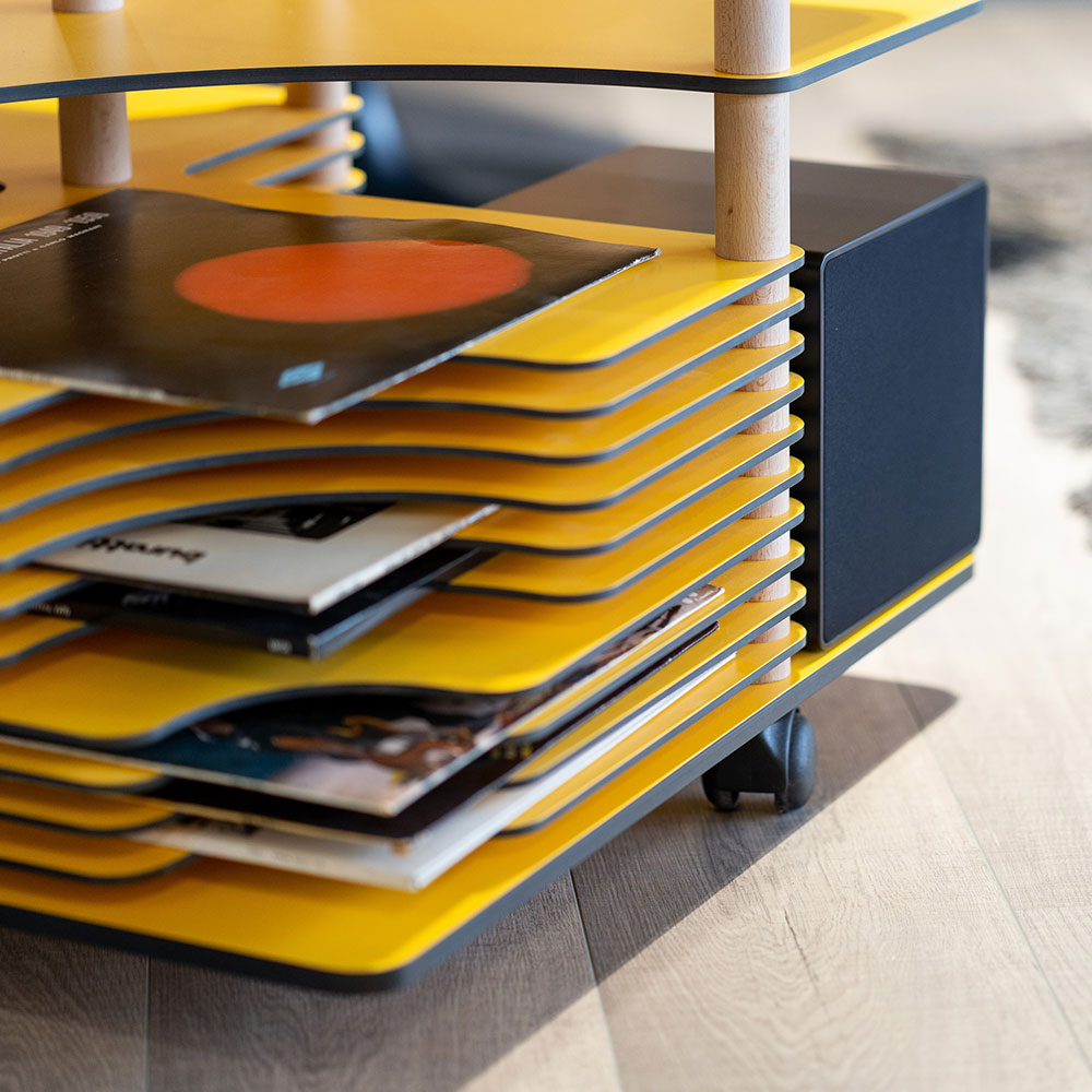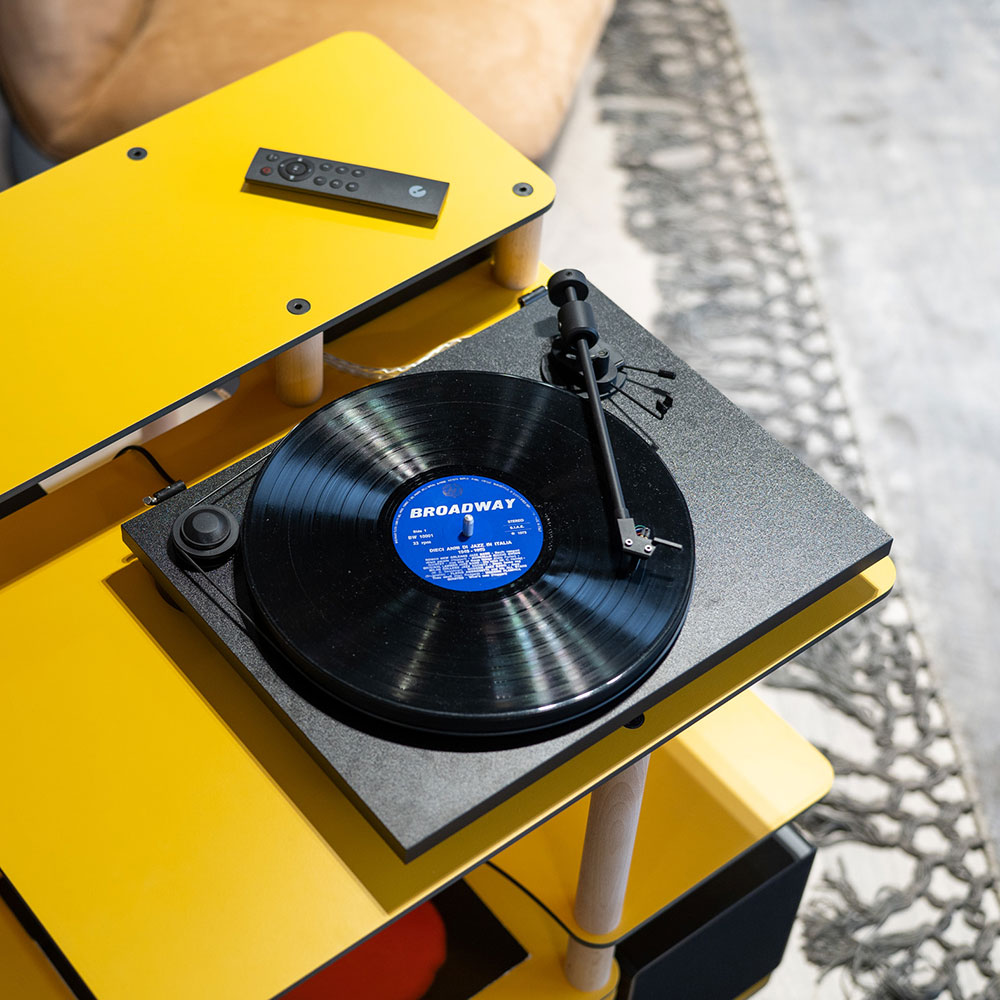 Joe Colombo’s vision of the future materializes in a piece of furniture on wheels, suitable for hosting vinyls, vinyl player and speakers.