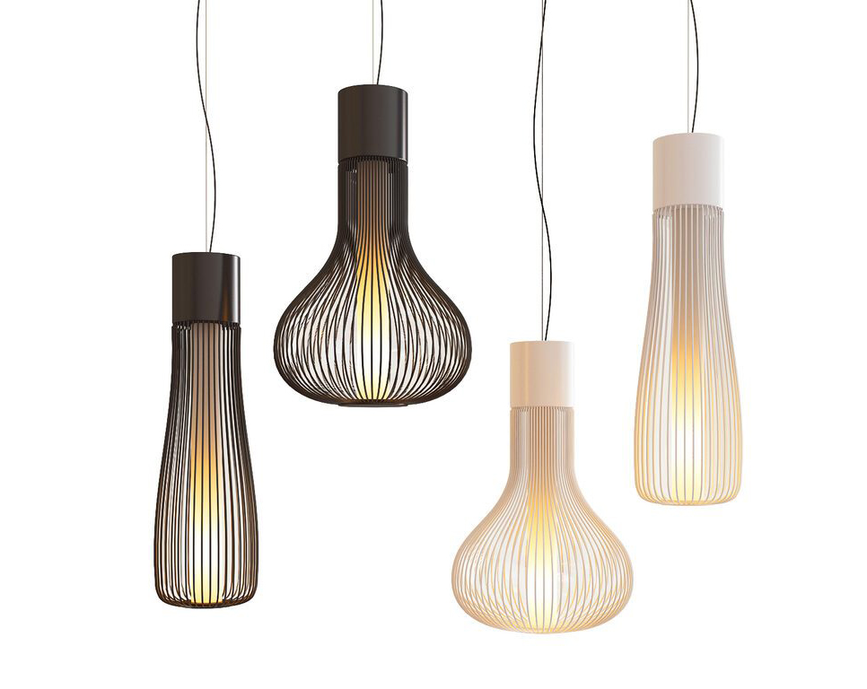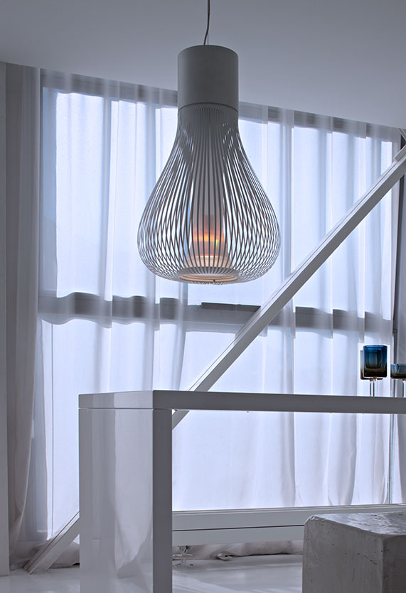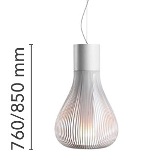 Suspension lamp providing diffused lighting. Chemically photo-etched stainless steel body and borosilicate diffuser. Liquid paint protection. Die-cast aluminum base, 30% fiberglass-reinforced polyamide ceiling rose attached to a pressed and galvanized steel ceiling fixture. In this version the light emission can be adjusted by means of a mechanical movement that opens the louvers, thereby varying the shape of the luminaire. Steel suspension cable, FEP/PVC power cord of the same color as the luminaire.