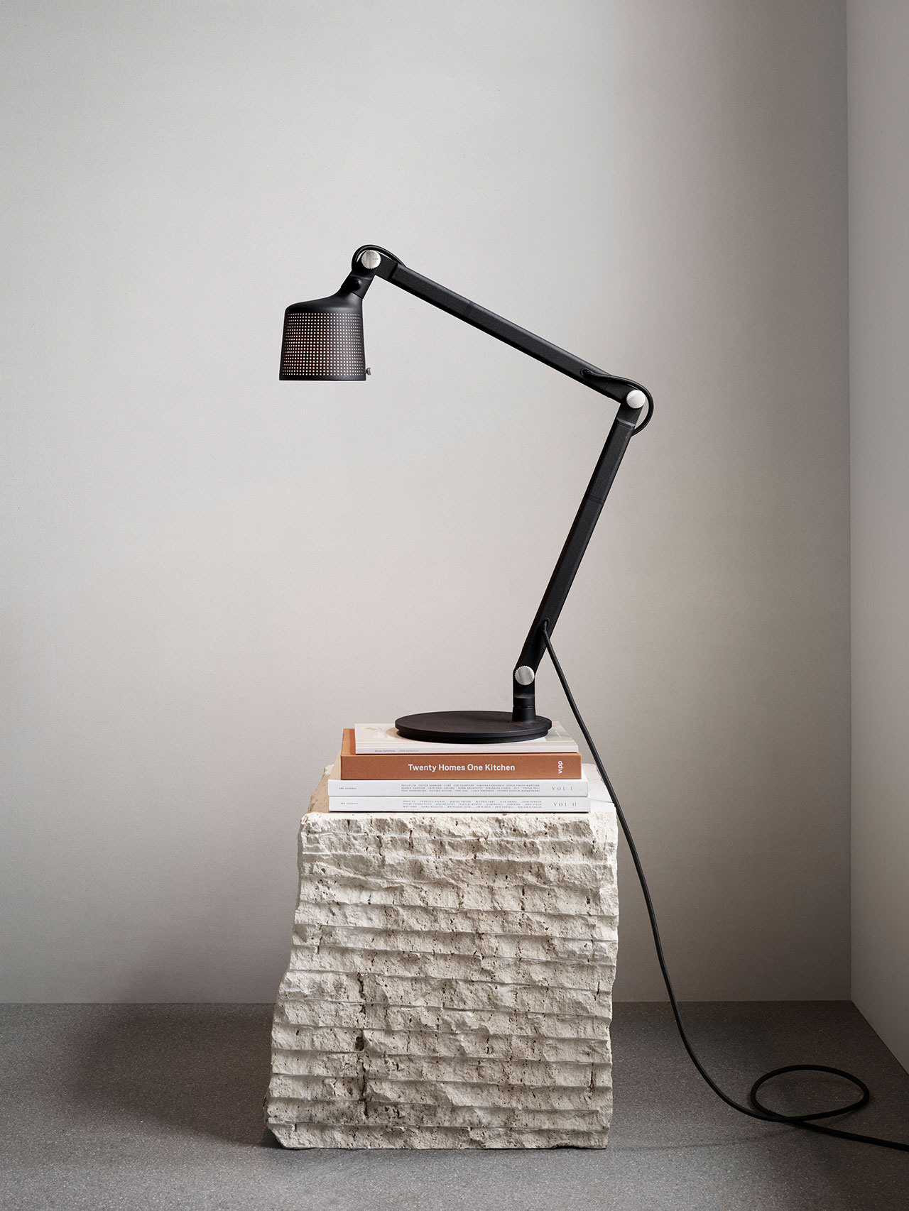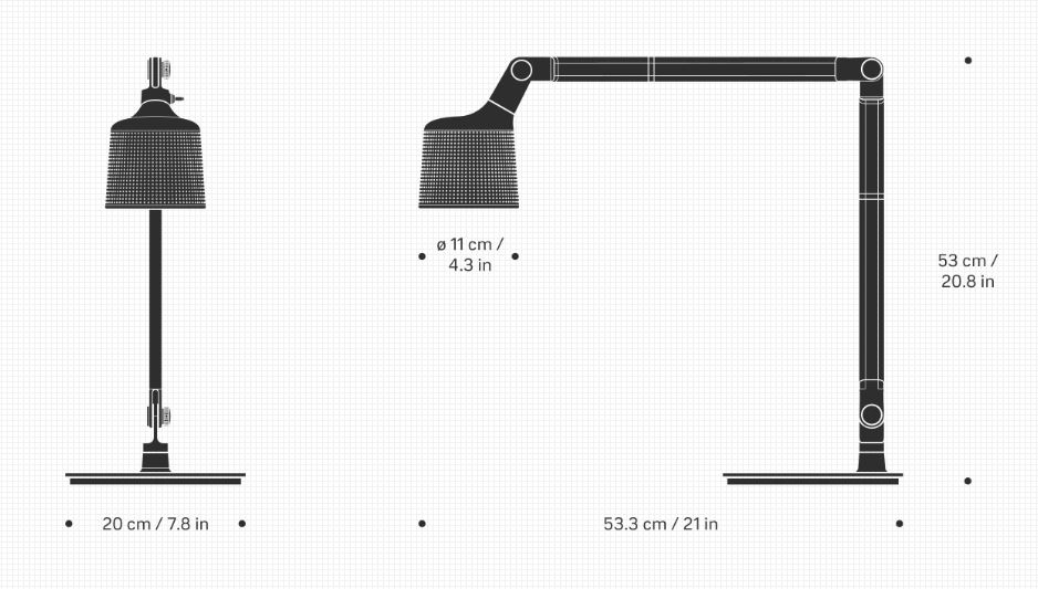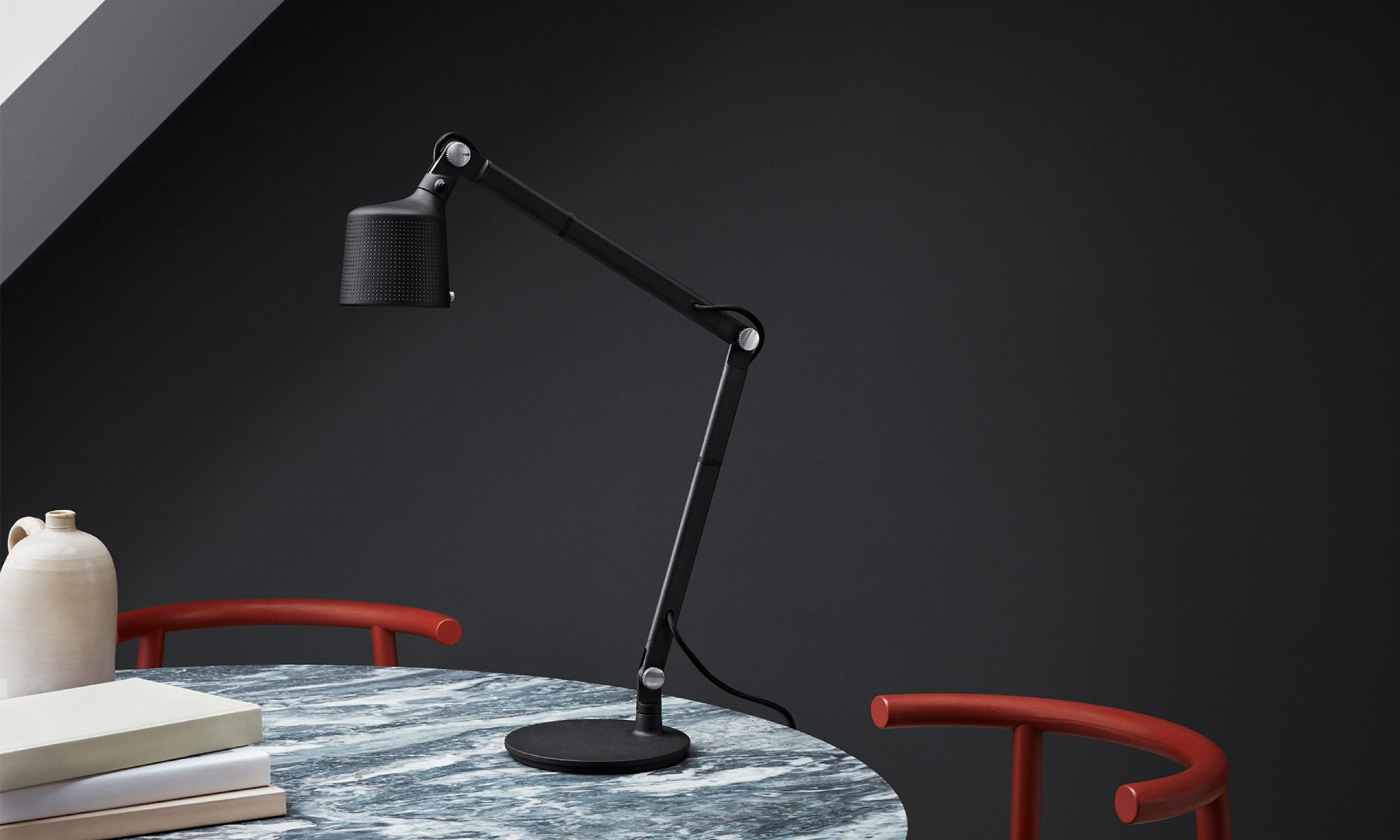 The Vipp desk lamp is a work lamp for the office or the home. It is equipped with an adjustable arm, finger screws, and a solid base for stability. The desk lamp has a perforated shade and matte glass for a pleasant diffusion of light.