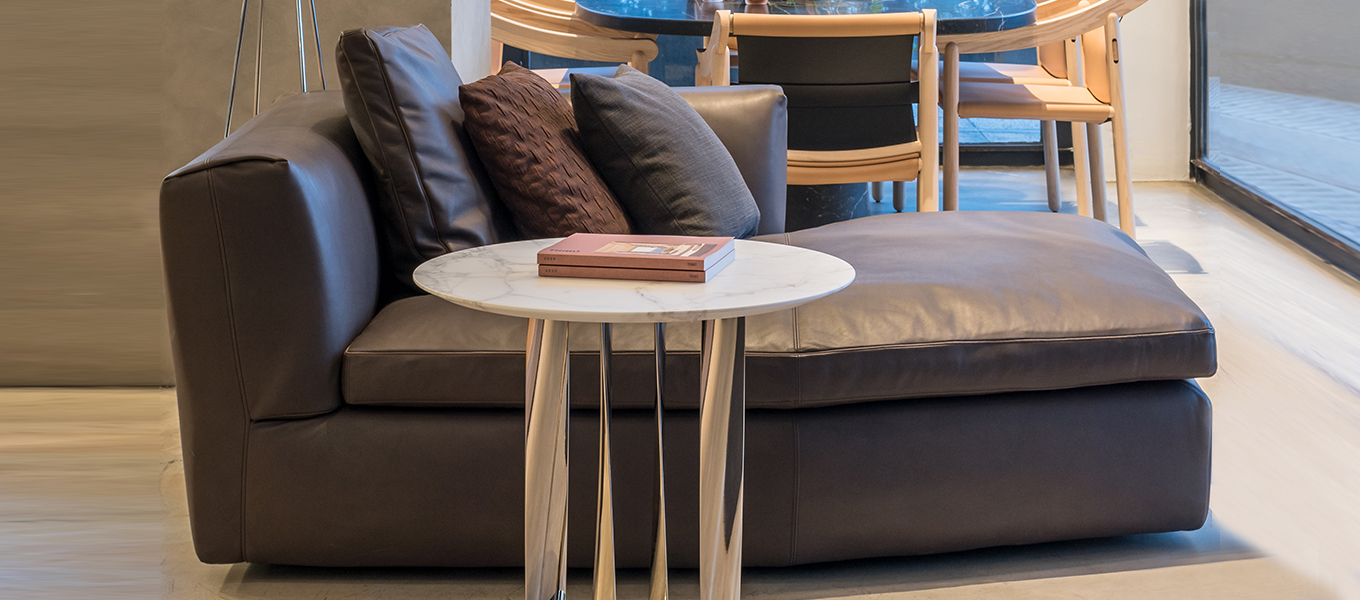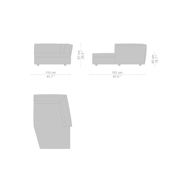 The geometric lines and asymmetrical elements, like the integrated chaise longue, lend versatility, while the open slant of the backrest/armrest emphasizes its inviting allure. The higher backrest cushion, matched with an additional bolster, lend greater comfort to the lumbar spine and softness in the shoulder area.