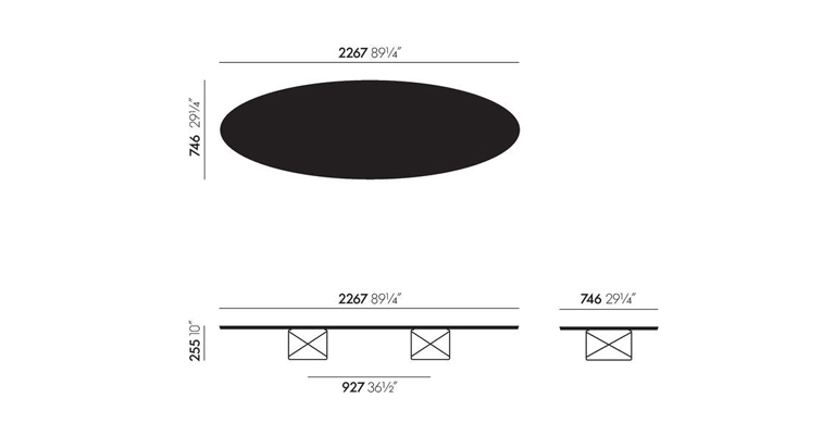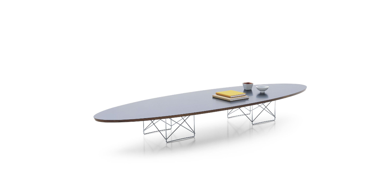 The expansive, elegant ETR sofa table by Charles and Ray Eames comes with tops in a choice of black or white and a wire base with a chrome-plated or black powder-coated finish. On account of its elliptical shape, it quickly acquired the nickname ‘surfboard table’.
