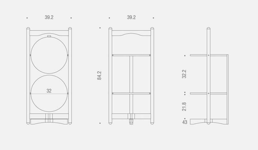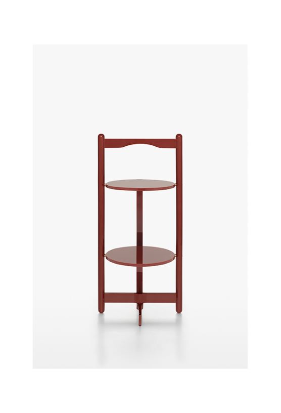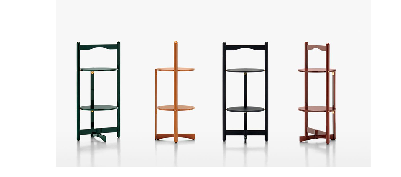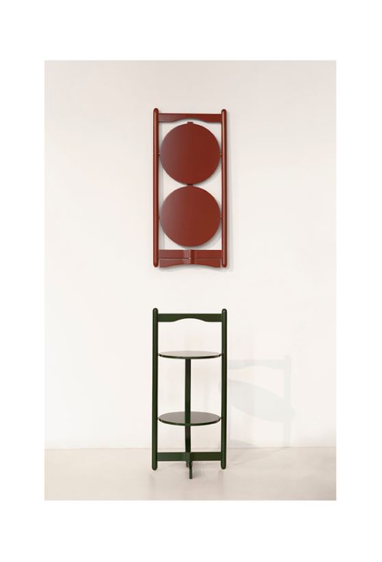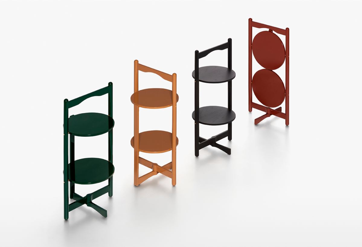 Originally created by Vico Magistretti in 1989, Florian is one of the new 2021 designs remastered from the Acerbis archives. Ingeniously functional, the Florian represents Magistrettìs supreme simplicity, with a lightweight, multi-level table built on a foldable structure inspired by a broom handle, which collapses flat to hang on the wall as a graphic object of circles and lines. In Meda and Lopez Quincoces’s version, the Florian’s size adapts to modern living, its ash wood frame folds smoothly and quickly with a modern brass mechanism, and its graphic impact is bolstered with lacquered tones of mustard, green spruce and brick — a democratic passe-partout for the contemporary home.