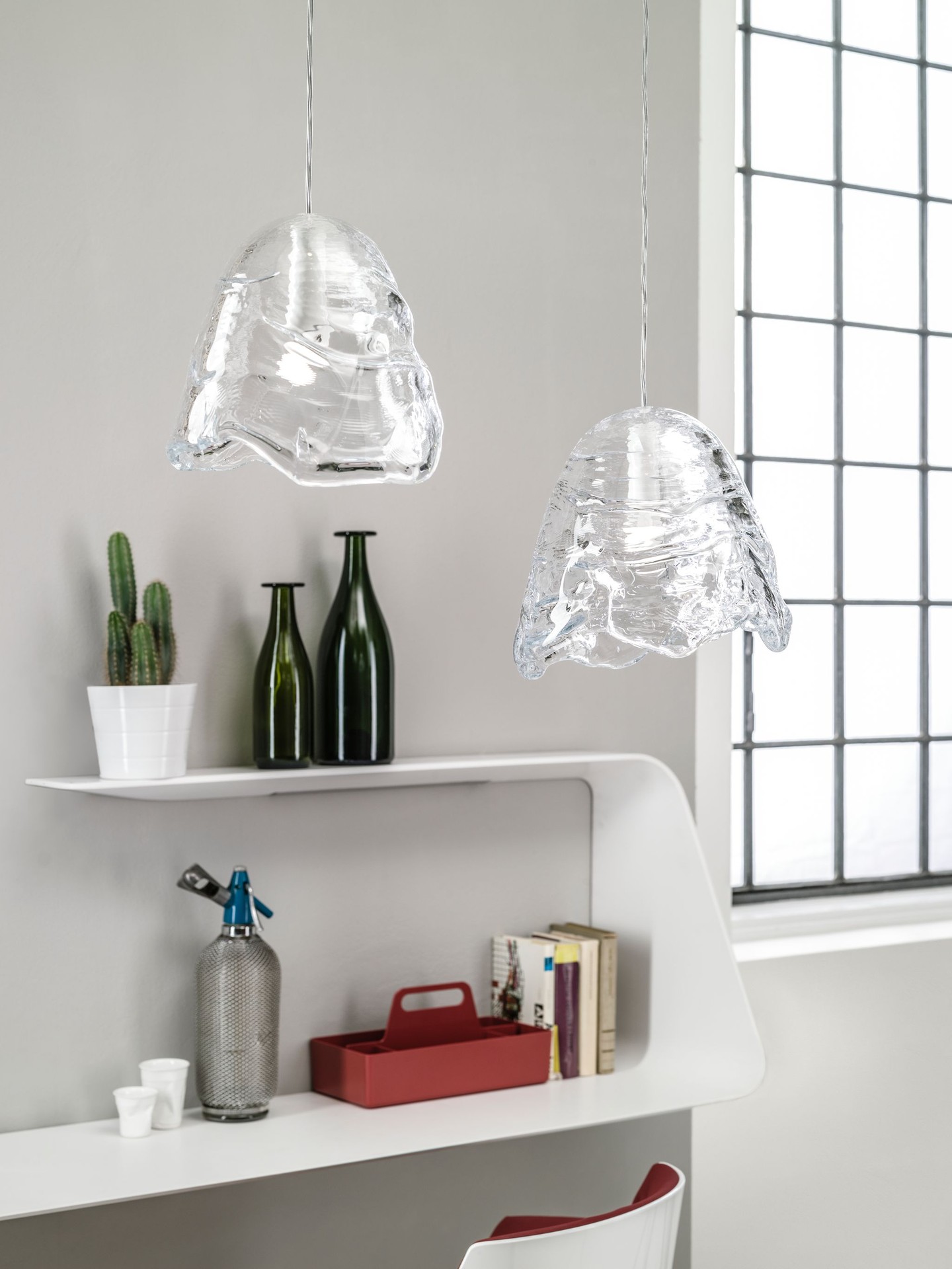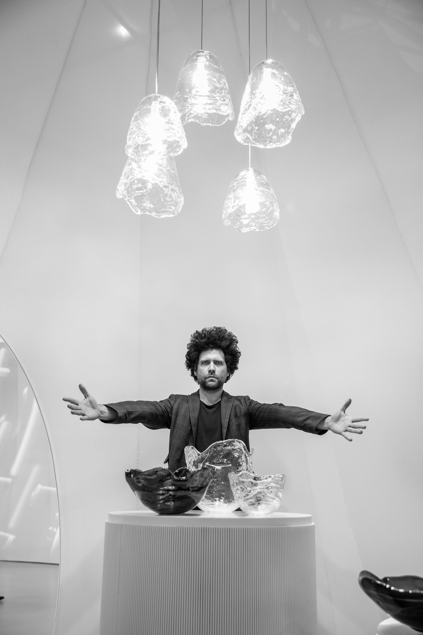 The Frozen collection was inspired by the transformation of water into ice. Velčovský allows the glass to spill over a metal form and seeks advantage in its natural properties. Each piece traces a unique record of the process, becoming an original. The author found inspiration among pieces of ice created by nature and applied that element of randomness in nature to his craft in the context of glassmaking.