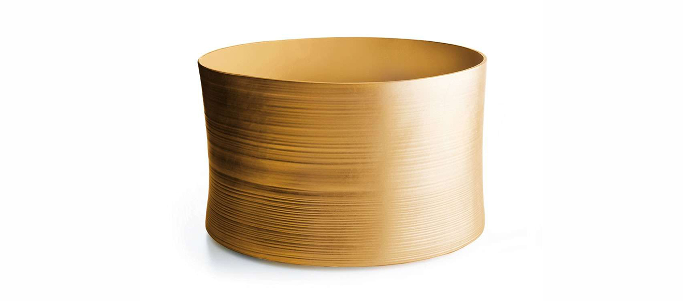 Gold Collection, three oversize objects by Marcel Wanders. A vase 78 centimetres tall, a stool and a bowl, all in ceramic covered in gold leaf. Icons of luxury not without a certain sense of humour.