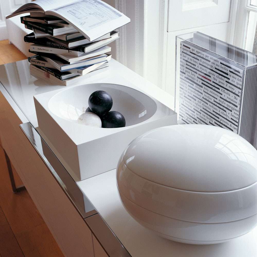 An egg with its container, a solid and a hollow part, the convexity and concavity of a hold-all container. In an elegant glossy lacquer finish, available in black or white, Fukasawa presents his personal and humorous interpretation of the classic oriental theme of opposites, positive and negative, yin and yang. The container, a six-faced box with a cavity shaped like half an egg carved out of one side, is the perfect bowl or fruit basket, with a purpose that can change according to the need of the moment. The egg can also be taken apart into four ready-for-use trays.