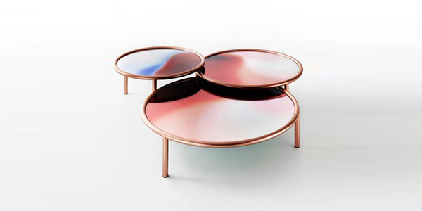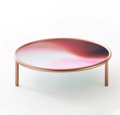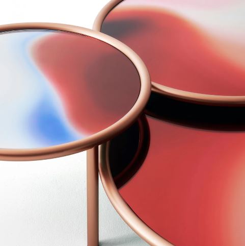 Low round tables with tubular metal structure painted copper colour in a special metallic opaque finish. The top, in laminated glass, is a palette of colours on a mirrored background, blending and mixing with one another like gas or fluids, disguising the solid state of the material. The mirrored background lends a particular energy and brightness to these colour tones.