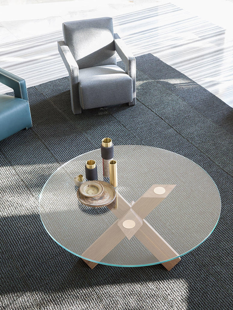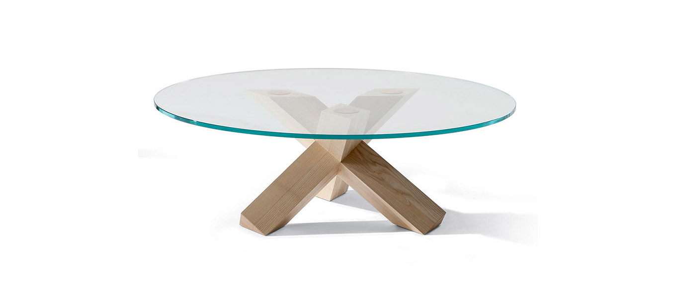The joins between these three elements are carved into the wood, thanks to Cassina’s extraordinary carpentry craftsmanship, where technical quality matches aesthetic refinement. The base is available in a variety of woods, with clear glass top.