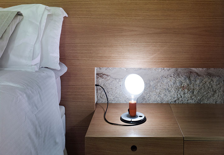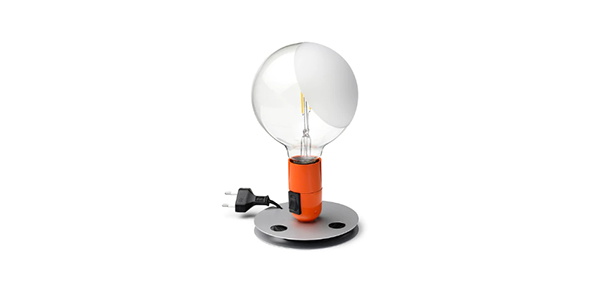 Table lamp providing direct, diffused light. Anodized aluminum base serves to contain excess power cord. Bakelite lamp-holder, painted to match the switch in the orange and black colors. Clear globe lamp is partially sandblasted to diffuse the light.