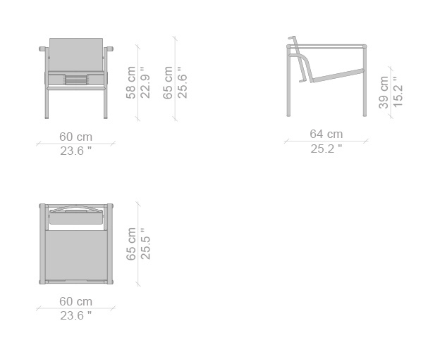 A lightweight, compact chair, designed in 1928 and introduced in 1929 at the Salon d’Automne [Autumn Salon], along with other extraordinary pieces, such as the Fauteuil Grand Confort, petit modèle and grandmodèle, the Table Tube d’Avion table and the Chaise Longue à reglage continu. Like the other pieces in the collection, the Fauteuil à dossier basculant armchair is the result of in-depth study of human posture and, in this case, is specifically engineered to provide perfect support for easy-going relaxation that is conducive to conversation. Its elegant simplicity of design allows the armchair to fit easily in various settings. It is also available in the 1928 Villa Church version and the 1930 version crafted for the French Union of Modern Artists exhibition.