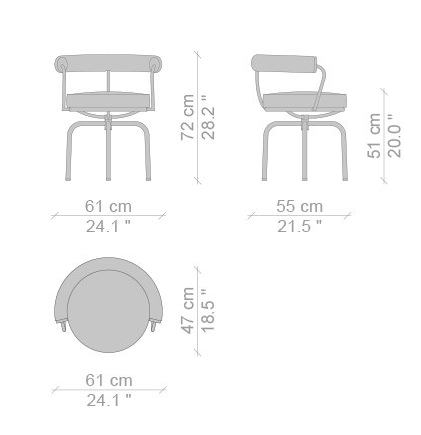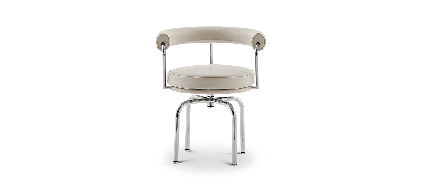 [Autumn Salon] in 1929, and is now part of the Le Corbusier®, Pierre Jeanneret®, Charlotte Perriand® Collection. The swivel armchair features backrest and seat cushion padded in polyurethane foam and polyester batting, with leather or fabric upholstery. Since 2016, the