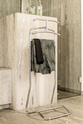 Valet stand. Tubular steel, powder-coated in black or chrome-plated. Silicone anti-slide strip for trousers. Plastic gliders in black.