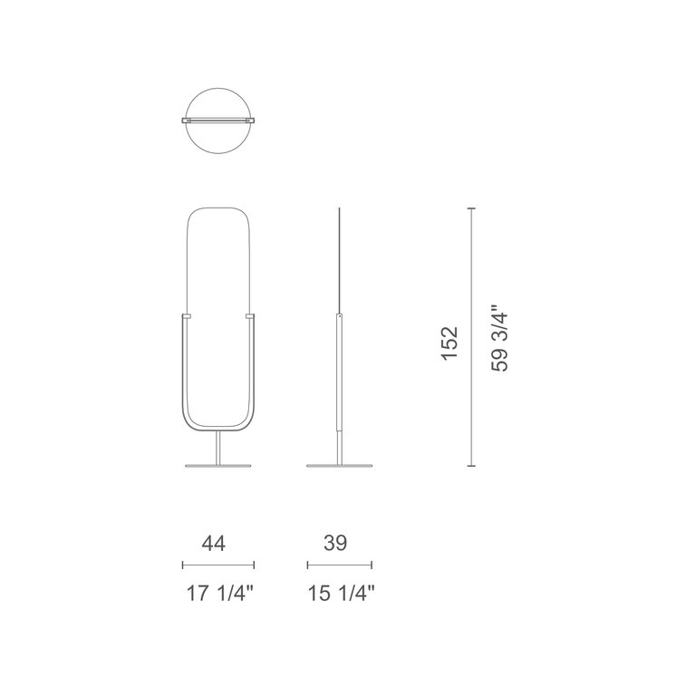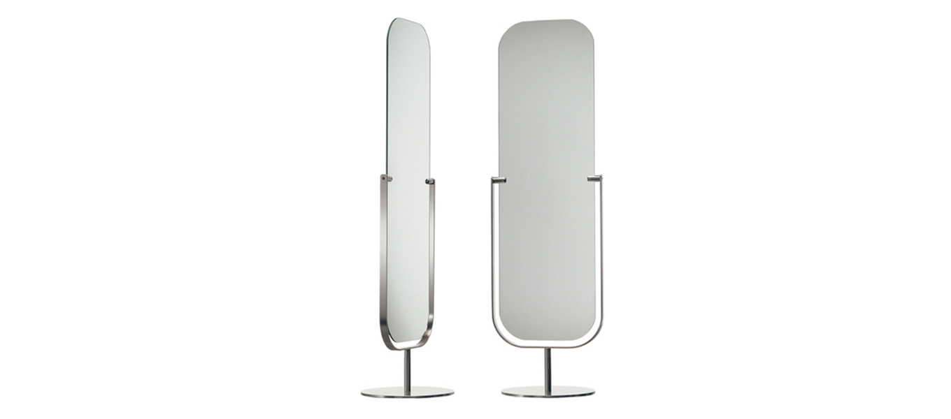 Mirror is free-standing and two-sided, with an adjustable tilt. Designed by Jasper Morrison, the base and frame are made of satined nickel