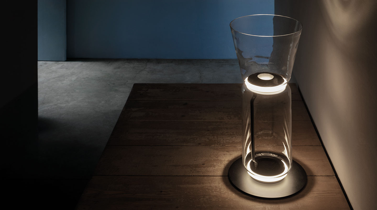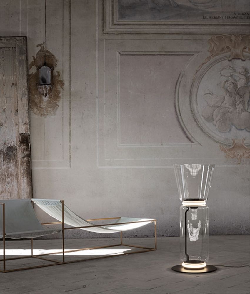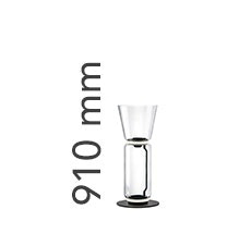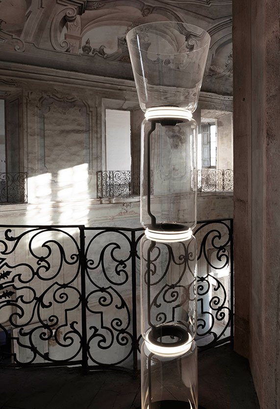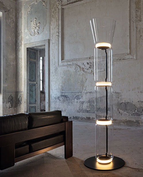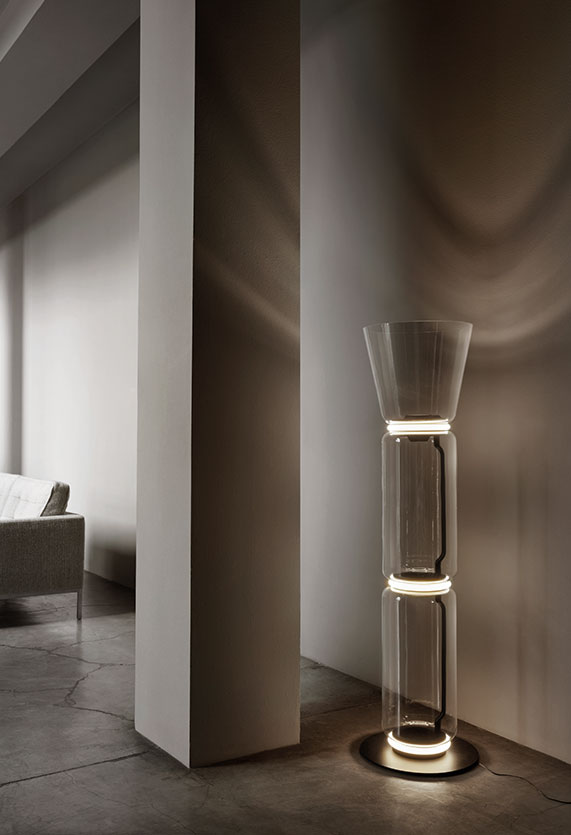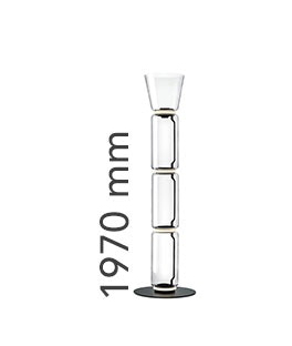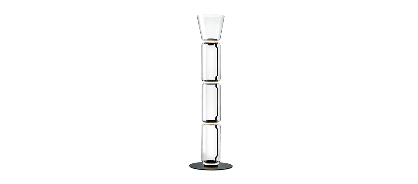 Standing lamps consisting of interconnecting glass modules reaching a height of 2,17 metres (85.43″). Cylindrical and semi-spherical transparent blown glass structure, die cast aluminium base and rings, hydroformed steel internal lateral arms and injection moulded optical opal silicone outer ring diffusers. The power supply cable is 2 metres (78.74″) long, with a pedal operated panel used as a dimmer to adjust the light intensity by 10% to 100% in either direction. Wall mounted power supply unit with interchangeable plugs.