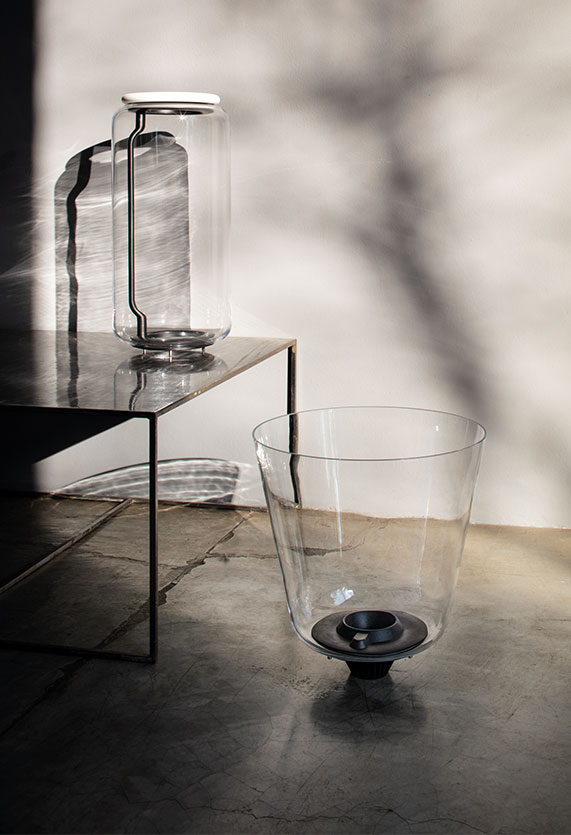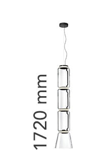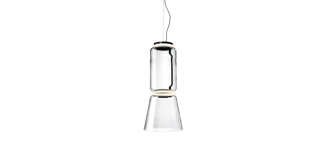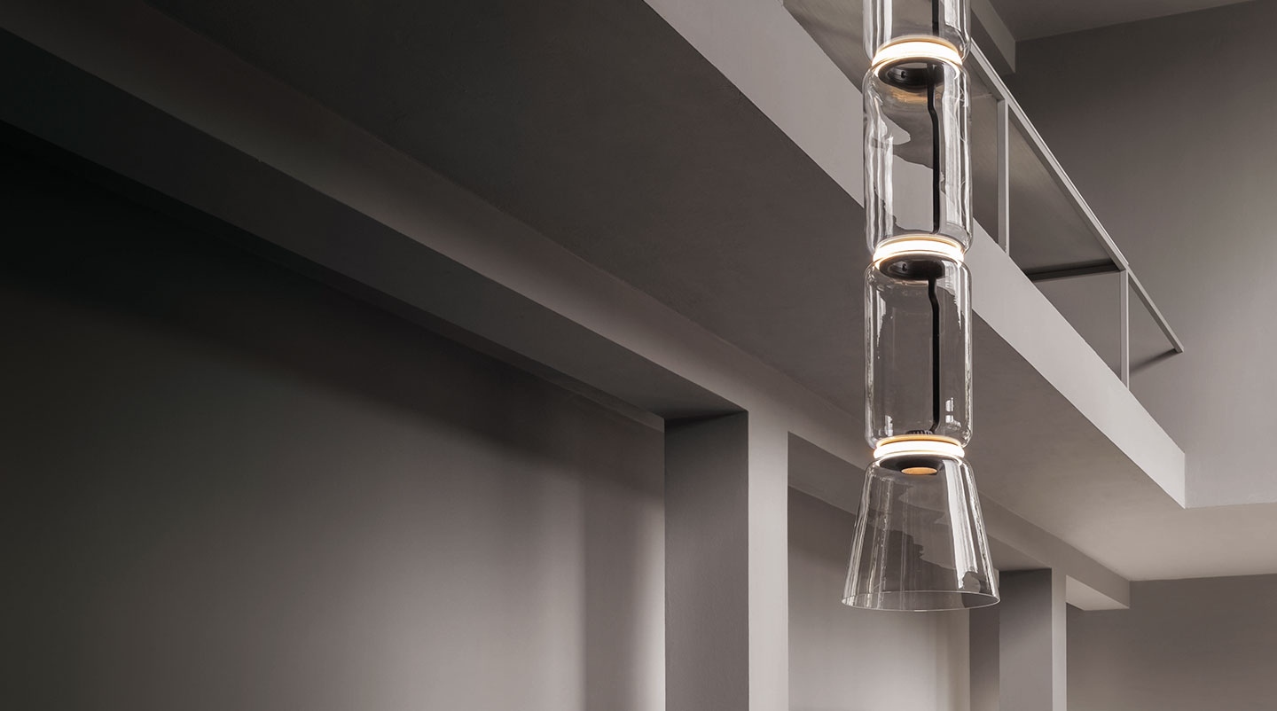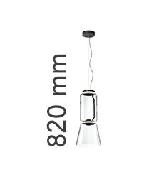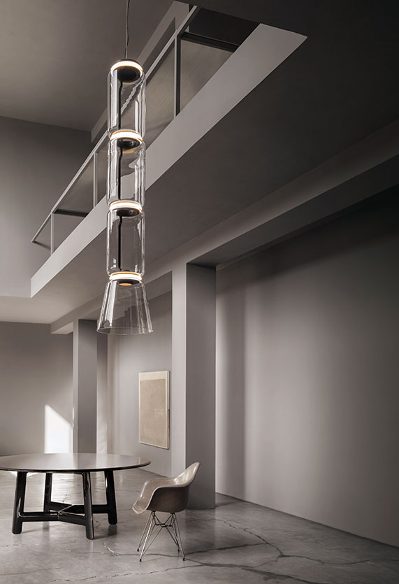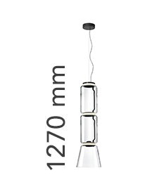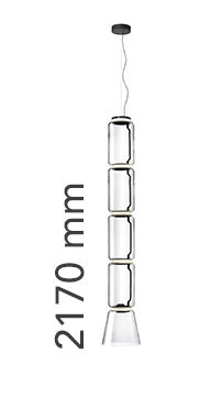 Hanging lamps consisting of interconnecting glass modules reaching a length of 3,2 mt. (126.77″) with 4 mt. (157.48″) suspended power cable. Cylindrical and semi-spherical transparent blown glass structure, suspended die cast aluminium ring connector, hydroformed steel internal lateral arm and injection moulded optical opal silicone outer ring diffusers. The power supply unit within the ceiling rose can be used as a dimmer to adjust the light intensity by 10% to 100% in either direction by means of the 0-10/1-10V, PUSH, DALI control.