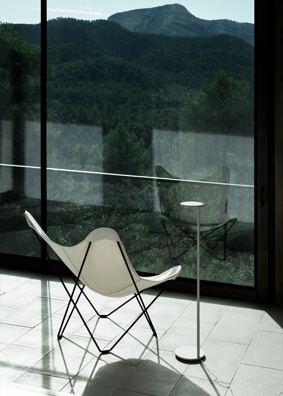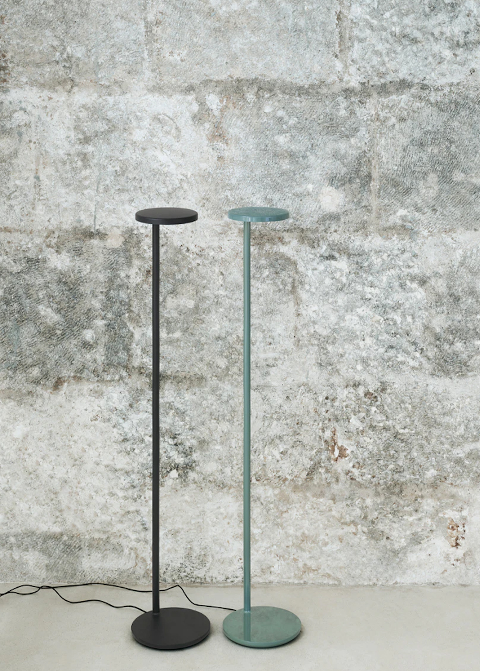 Floor lamp that, thanks to its innovative patented lens, offers asymmetrical light distribution and excellent visual comfort.