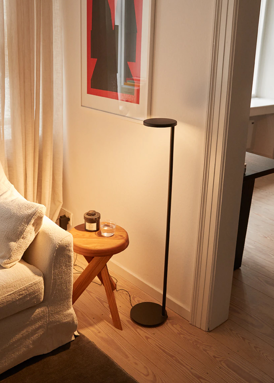 New floor lamp with patented asymmetric optics. External power supply included with 1500-mm cable. USB-C connection integrated into the base.
