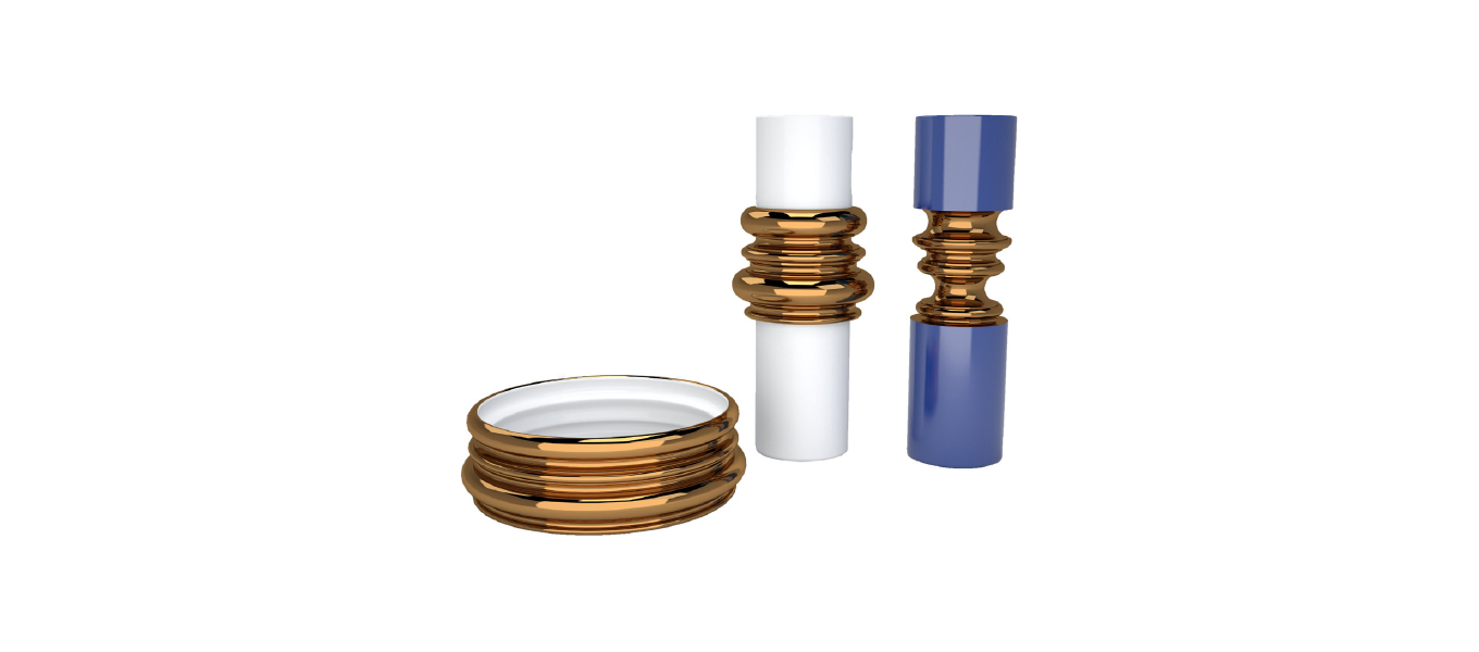 Ordini is a playful and surprising interpretation of classical architectural orders. The workmanship of the vases recalls the mouldings of vitruvian orders in which decorative architectural features become an ornamental element that plays with the cylindrical volume of the vase. The collection includes three elements, namely a broad vase, a narrow vase, and a table centre cup. They feature different decorations with a white and grey chiaroscuro (light-dark) motif or with solid colours (matt white and cobalt blue) enhanced by the warm touch of precious bronze colour mouldings.