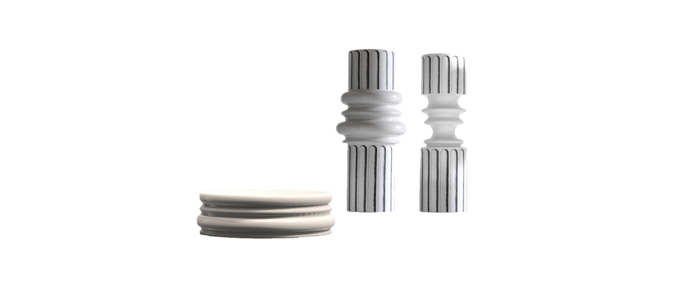 Ordini is a playful and surprising interpretation of classical architectural orders. The workmanship of the vases recalls the mouldings of vitruvian orders in which decorative architectural features become an ornamental element that plays with the cylindrical volume of the vase. The collection includes three elements, namely a broad vase, a narrow vase, and a table centre cup. They feature different decorations with a white and grey chiaroscuro (light-dark) motif or with solid colours (matt white and cobalt blue) enhanced by the warm touch of precious bronze colour mouldings.