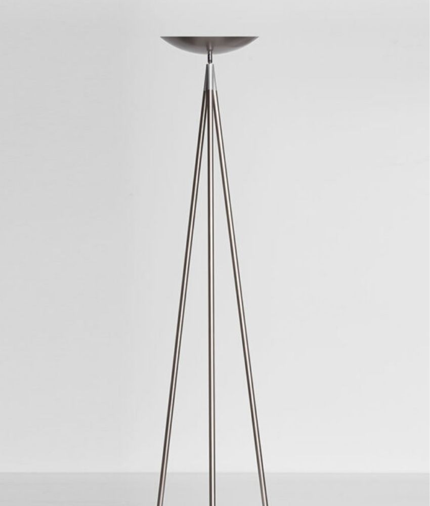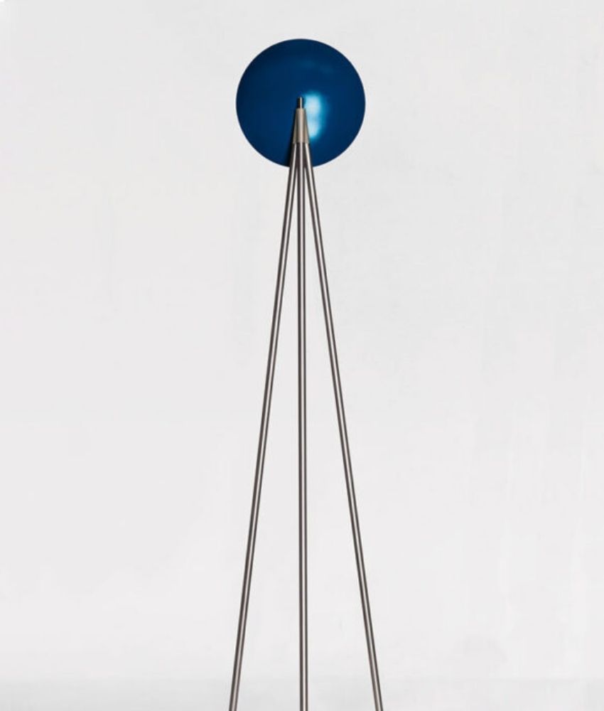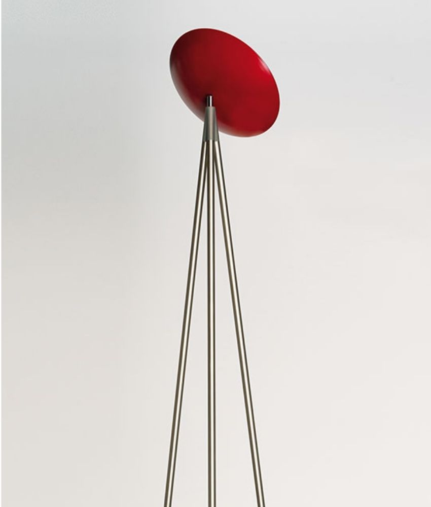 Palomar, a floor lamp dated 1984, in Codiceicona’s 2019 re-edition reveals a slender tripod of long cylindrical-section painted metal rods, aggregated at the extreme end of one end, to support the steel parabola that reflects the light, fulcrumed on the joint that allows it to be oriented. The absolute respect for the original lines of the whole confirms the timeless appeal of Palomar. The adaptation of the technical parts, with the adoption of LEDs, which can be fitted with dimmers, highlights its adequate usability.