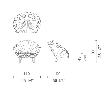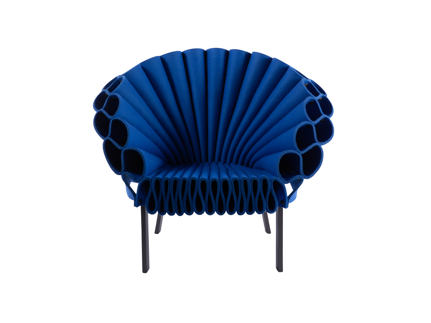 With the Peacock armchair, Dror Studio in New York makes a strong statement: this exuberant armchair made of rippled folds of felt fabric is eye-catching; with sinuous curves that challenge the laws of physics and a spontaneous, irreverent attitude.The base is made of powder-varnished metal, anthracite in colour. The Peacock armchair is available in monocolour versions (in blue or green).
