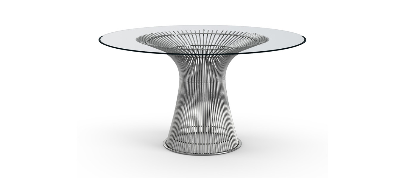 In 1966, the Platner Collection captured the “decorative, gentle, graceful” shapes that were beginning to infiltrate the modern vocabulary. The iconic dining table, which creates a focal point for any dining room, is created by welding curved steel rods to circular frames, simultaneously serving as structure and ornament.
