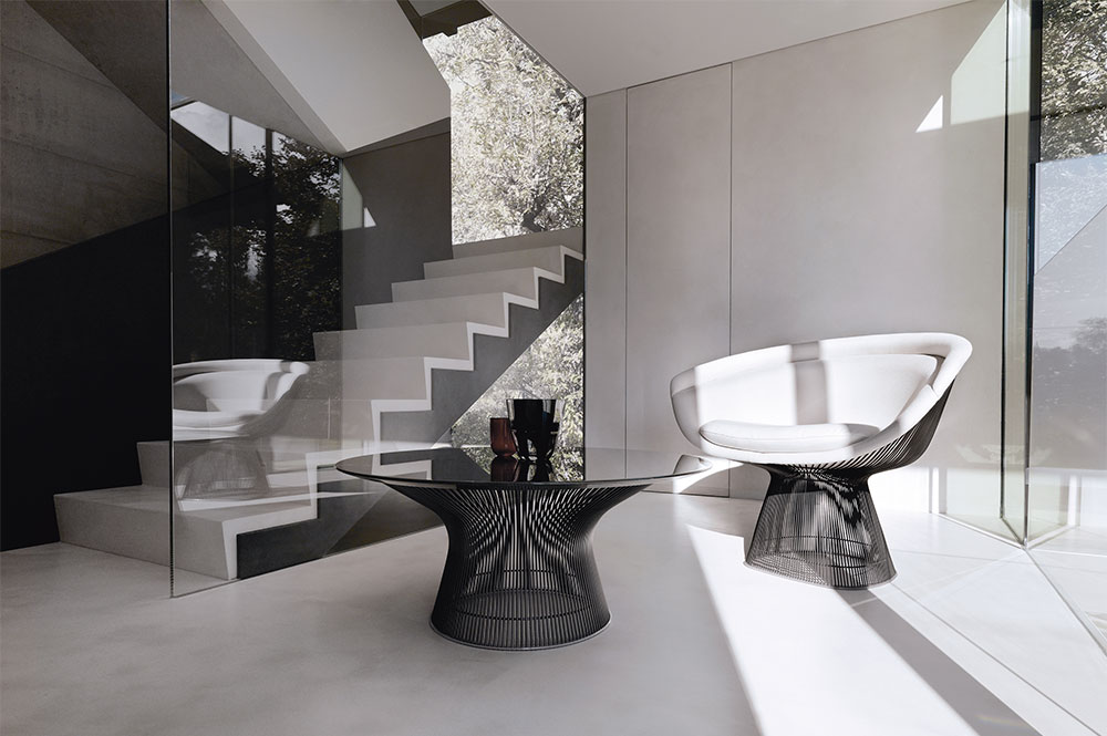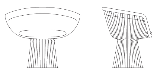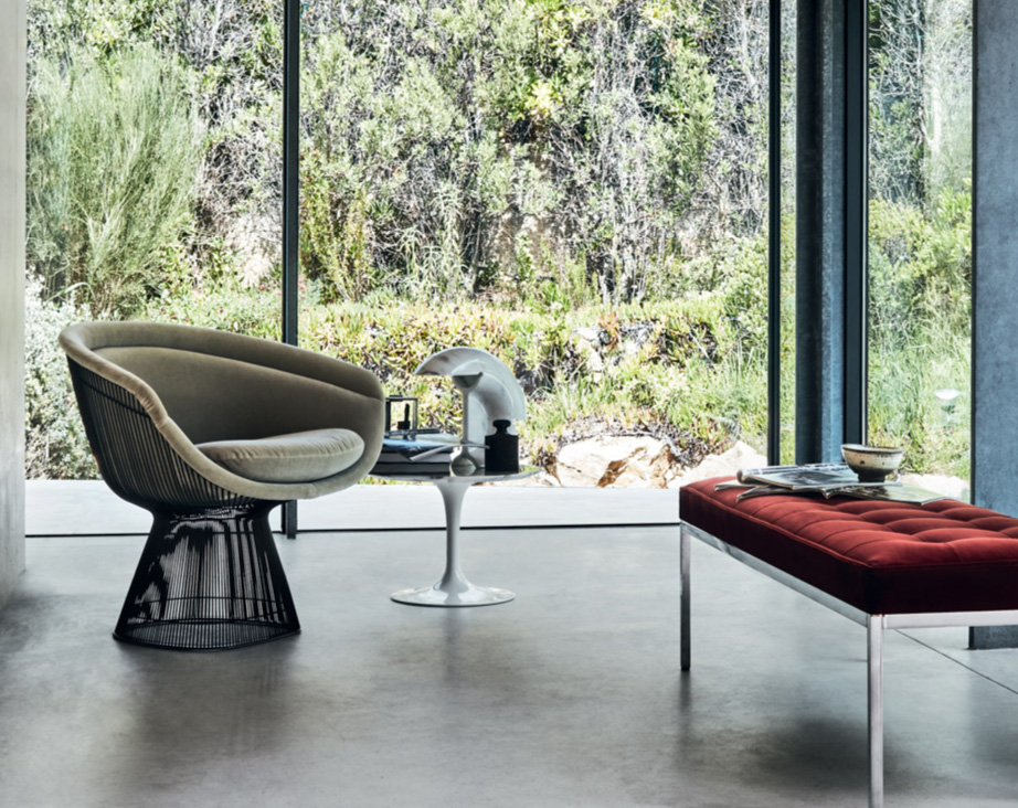 In 1966, the Platner Collection captured the “decorative, gentle, graceful” shapes that were beginning to infiltrate the modern vocabulary. The iconic lounge chair is created by welding curved steel rods to circular and semi-circular frames, simultaneously serving as structure and ornament.