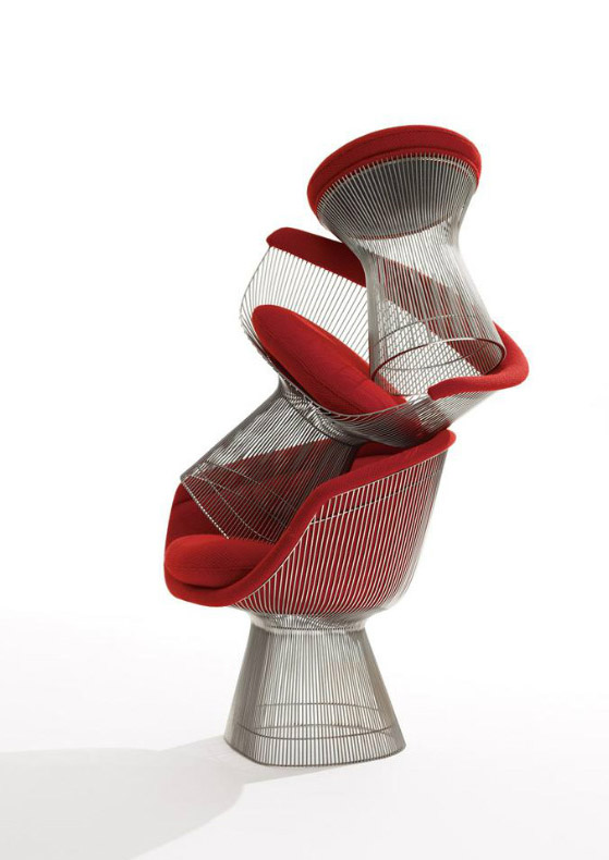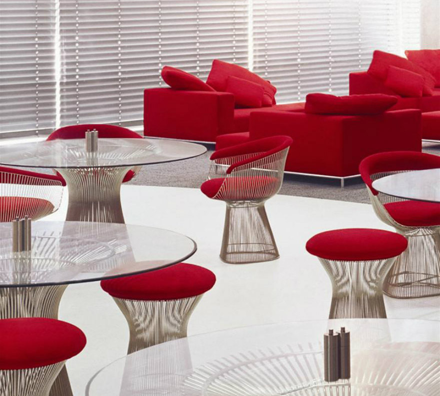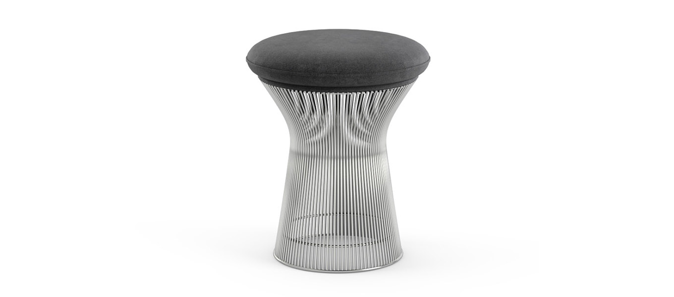 In 1966 the Platner Collection captured the “decorative, gentle, graceful” shapes that were beginning to infiltrate the modern vocabulary. The pieces are created by welding hundreds of curved steel rods to circular frames, simultaneously serving as structure and ornament.