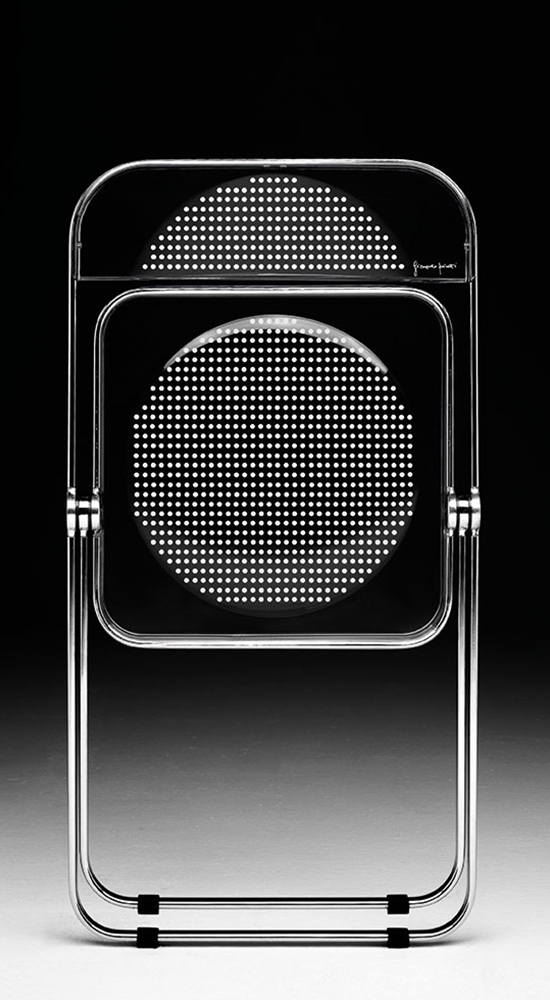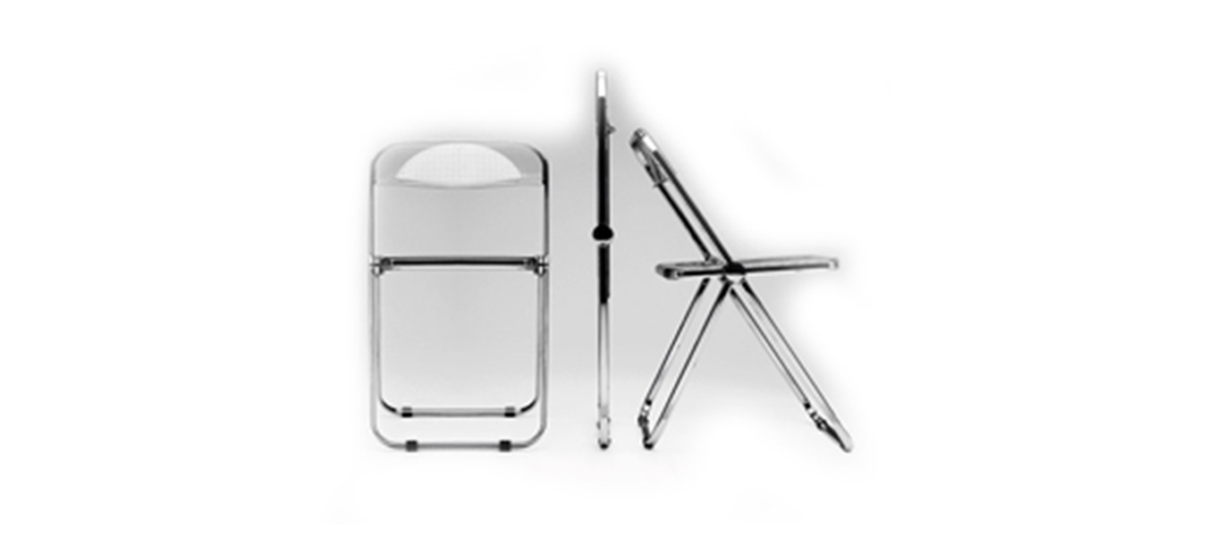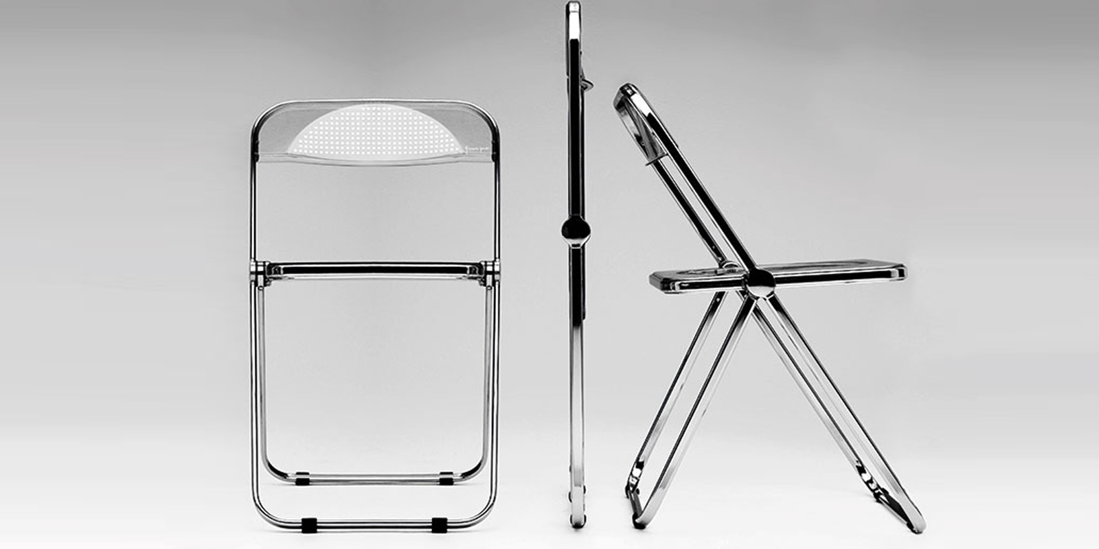 “I was thinking of creating a folding chair, where the dynamics of opening and closing of the rotating parts could be solved with a single joint, and also thinking of the seat and back stamped from a transparent plastic sheet on a structure of very thin steel tubes.” Giancarlo Piretti had in mind a theorem, which he intended to demonstrate: the joint as the fulcrum of action declares or negates the composition of the seat, and in action alternately achieves both forms, open for use, closed for storage.