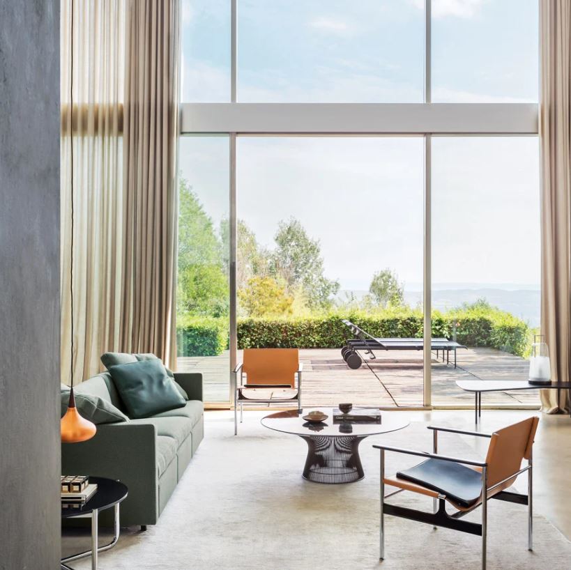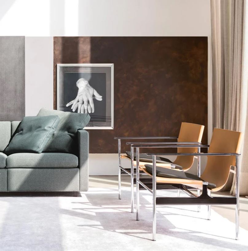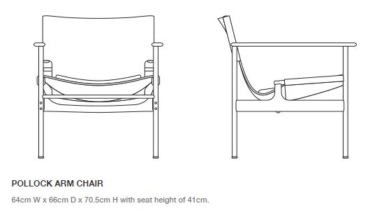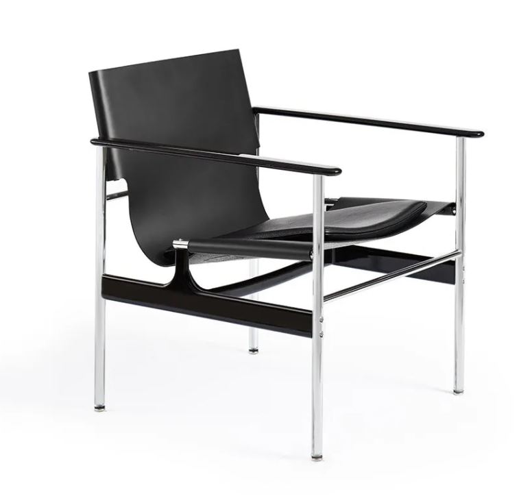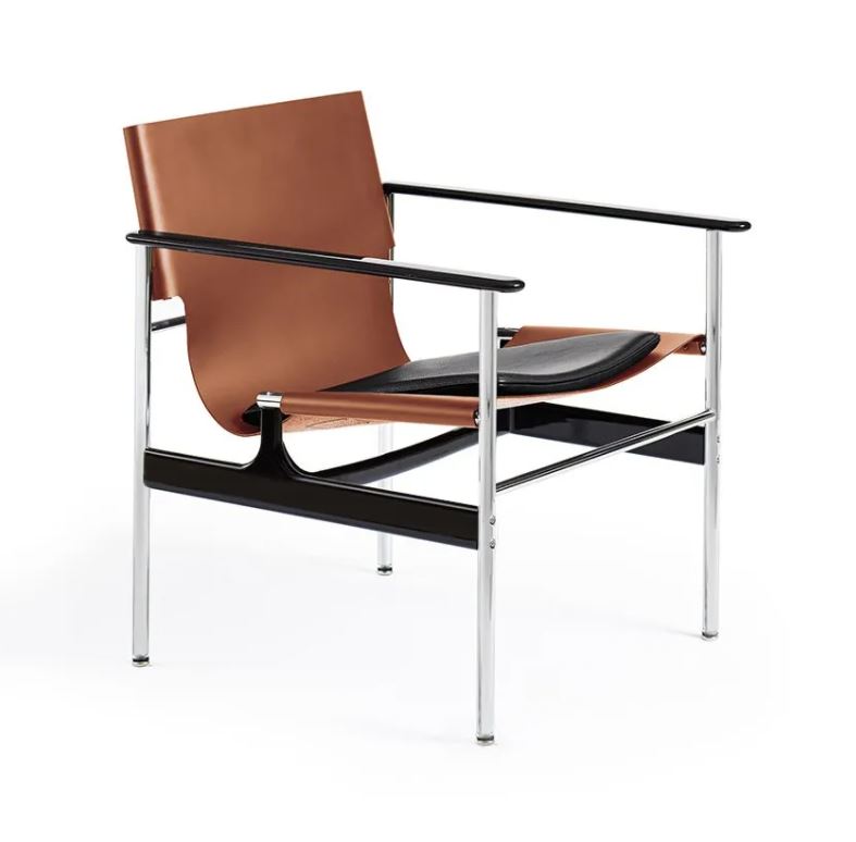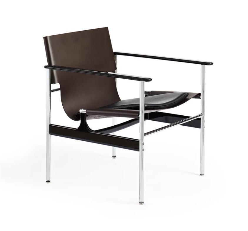 Designed in 1960 and originally manufactured from 1964-79, the steel and leather ‘sling chair’ or ‘657’, as it is commonly called, offers a refined combination of materials and finishes. Tubular steel legs connect to cast-aluminum arms and stretchers with exposed hardware, exemplifying Pollock’s simple design approach. The chair was reintroduced 2014.