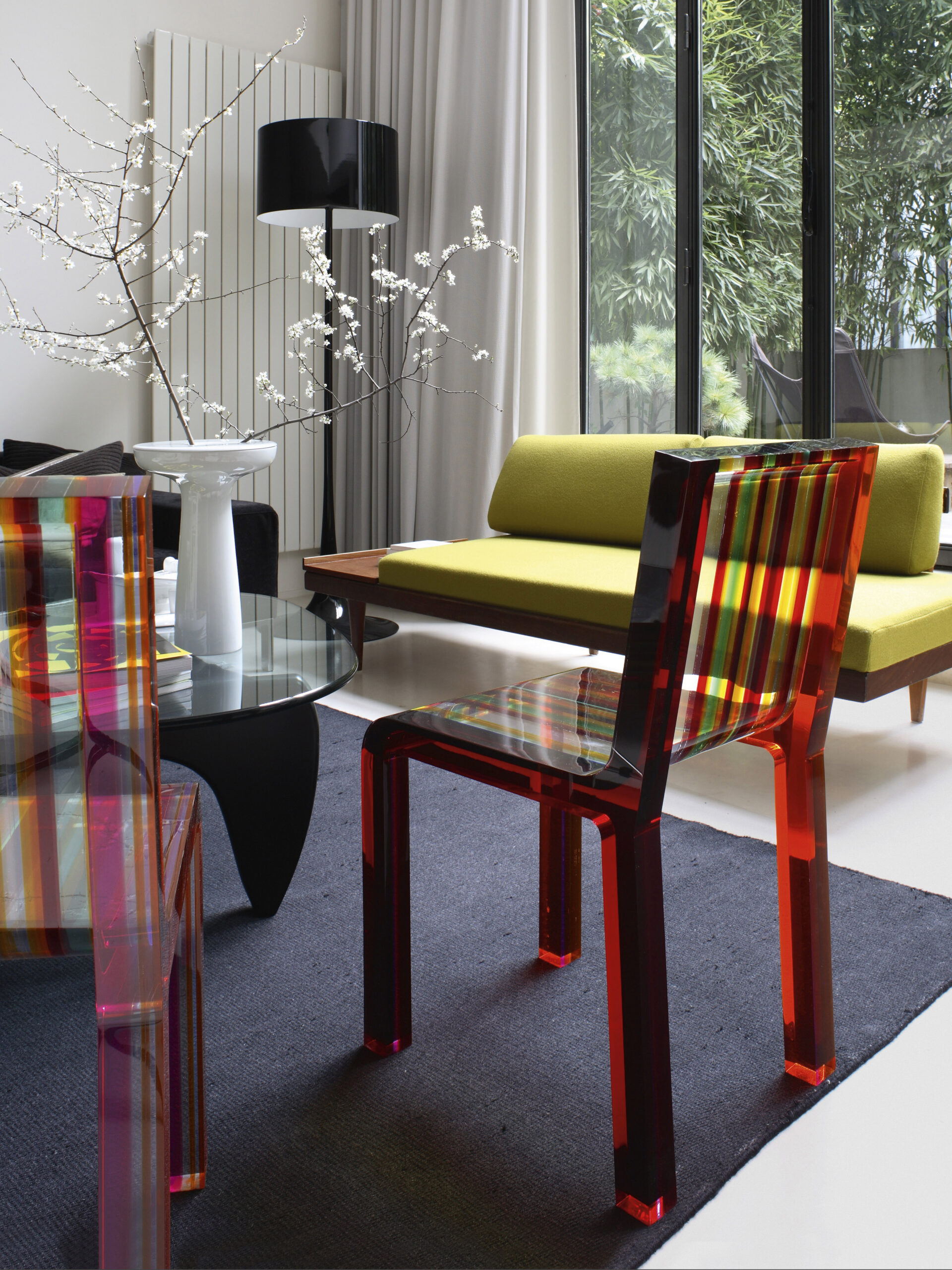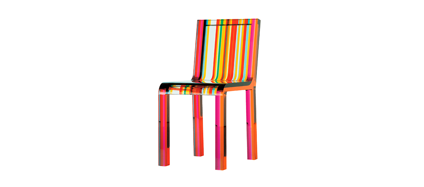 Made entirely of acrylic resin, the Rainbow Chair by Patrick Norguet is contains bands of different colours and widths which are fused together with ultrasound. The contrast between the essential lines and the explosion of colours makes this a captivating piece of furniture, a precious and vivacious result of the blend between technological research and artisanship. With a brilliant appearance, the mirror-like finish is obtained by virtue of a manual process.