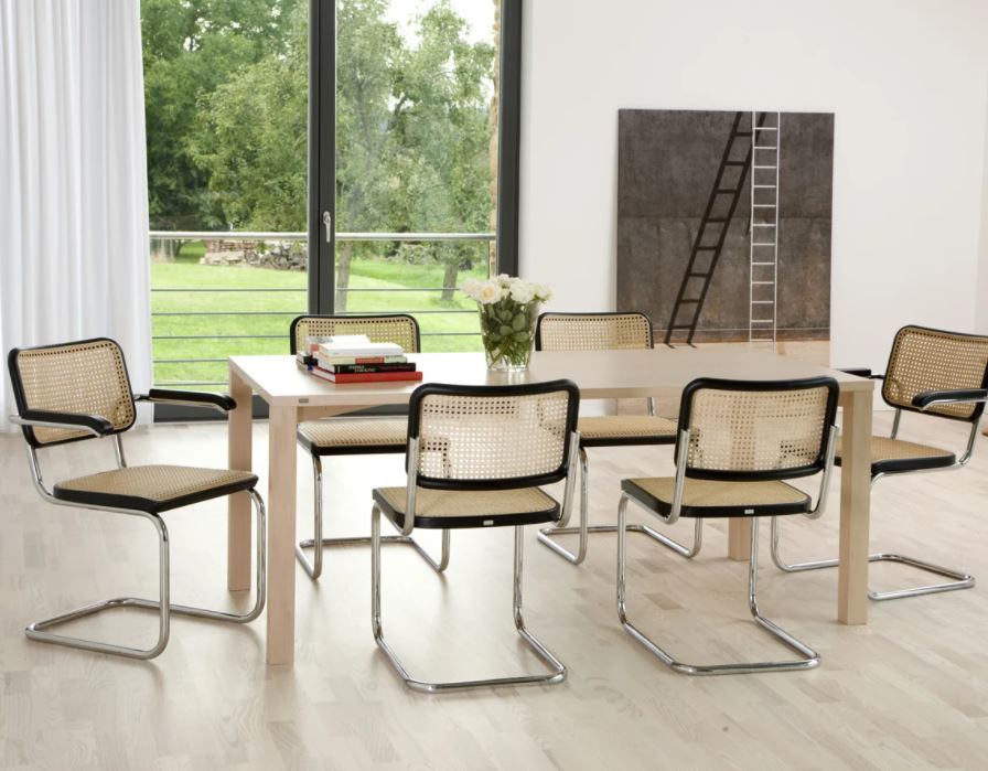 Among the tubular steel furniture models, the cantilever chair S 32 is especially versatile. It is at home in various design worlds and fits in with uncompromisingly modern interior design as well as in a diversified mix that gives space to different epochs and styles. The cantilever chair S 32 and the version S 64 with armrests are the most famous tubular steel classics. The appealing combination of new and old contribute to their popularity: Thonet’s tradition in the production of bentwood furniture with characteristic Vienna wickerwork, in contrast with the revolutionary use of tubular steel. Seat and backrest made of bent solid wood with wickerwork represent tradition, and the frame represents the present and future. With their versatility, they became bestselling cantilever chairs and still are today. Marcel Breuer designed the S 32 and S 64 during his time in Berlin in 1928. Thonet has been producing both models since 1930. Due to their aesthetic reduction and clarity combined with the airy wickerwork, the classics fit into the most diverse environments, from conference rooms and waiting areas to restaurants and private homes.