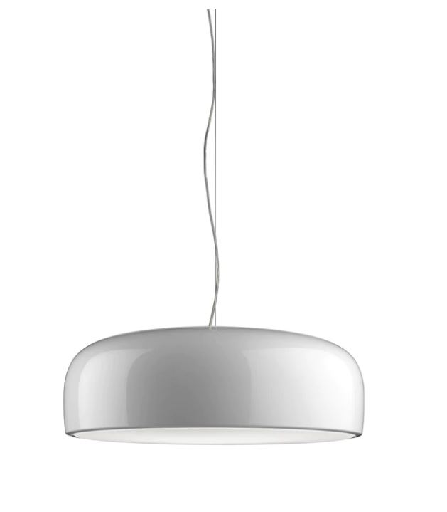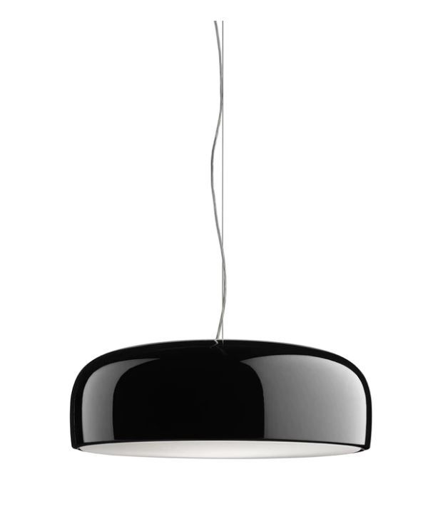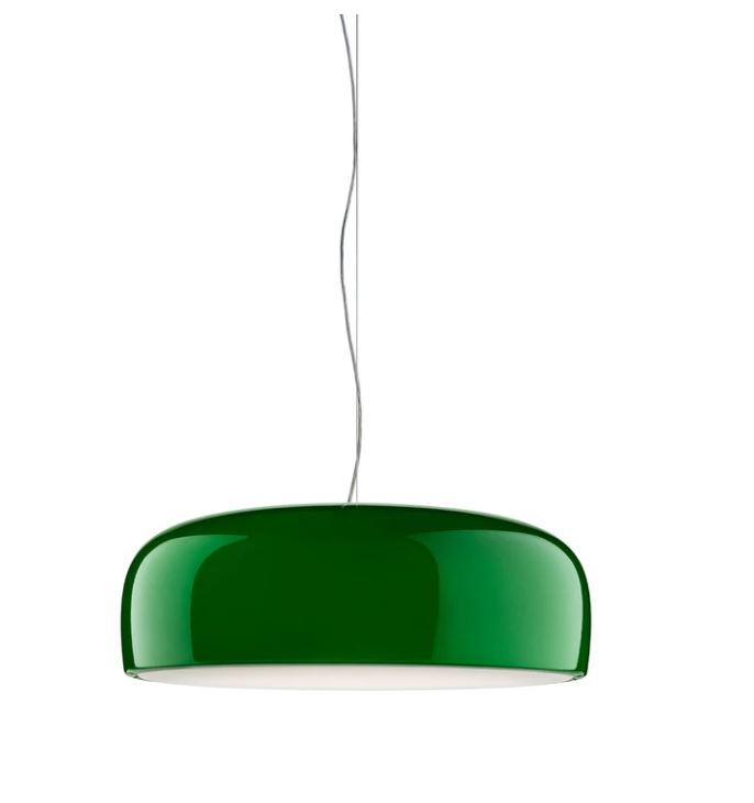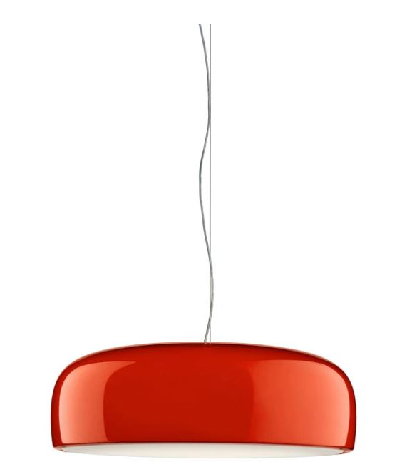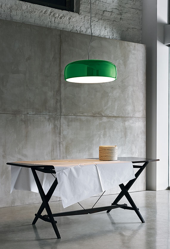 Suspension lamp with direct light. Aluminium body. Available in gloss black, red, green, white. Injection-moulded opalescent methacrylate diffuser. Steel ceiling attachment with steel suspension cable, 5 pole electric cable in PTFE double insulation, working length 2700 mm.