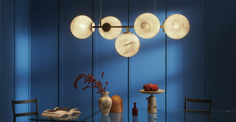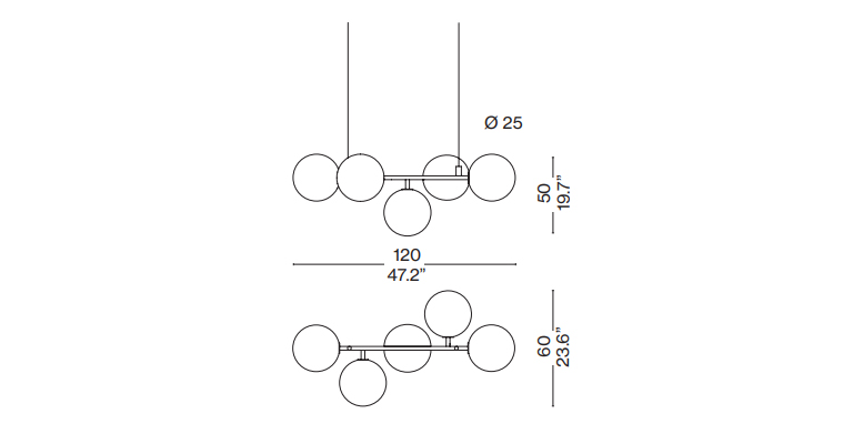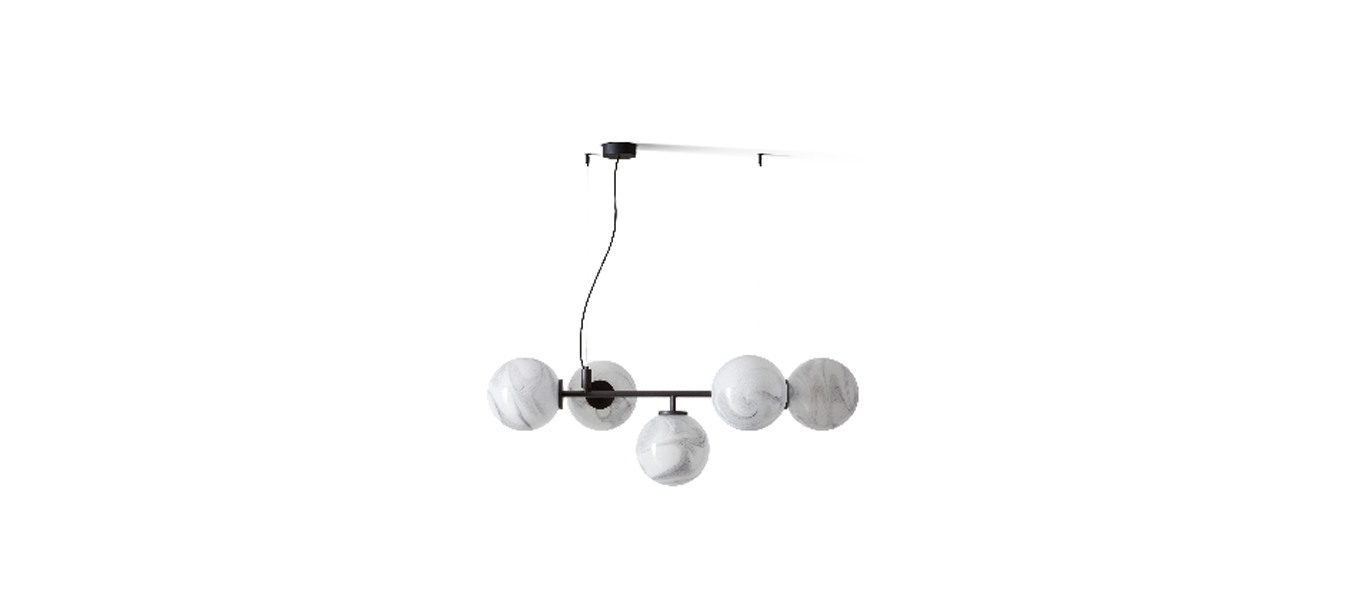 The Starburst chandelier offers new solutions and the option to use diffusers in the Bollicosa lamps, taking inspiration from the stars that light up the universe. A linear chandelier 120 cm in length, with black painted structure. Available with white acid-etched glass or white marbled finish.