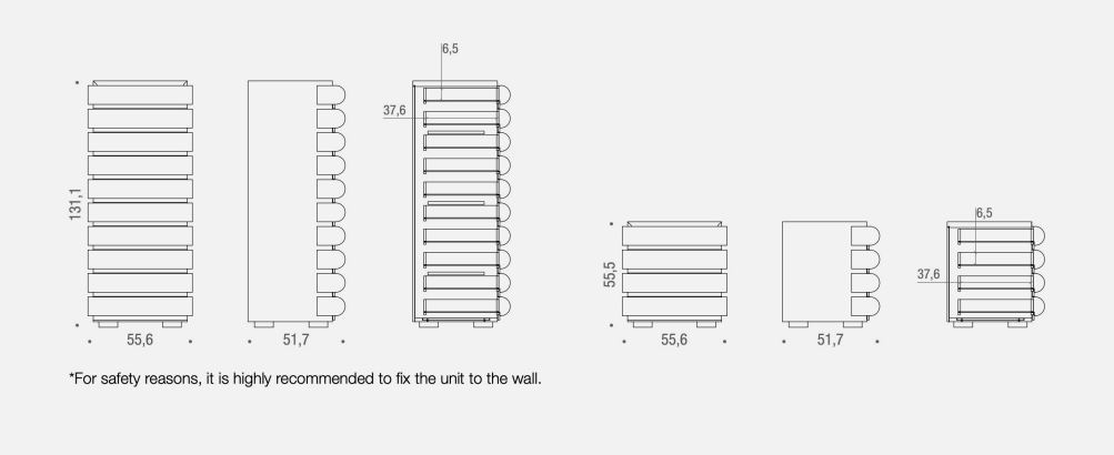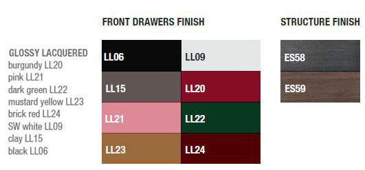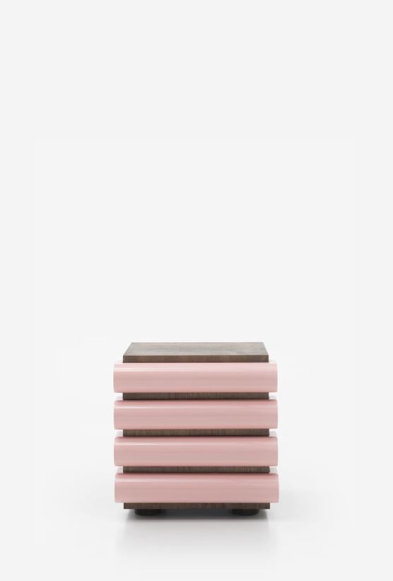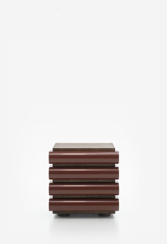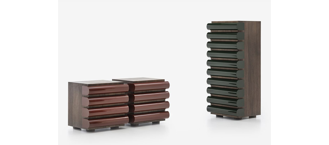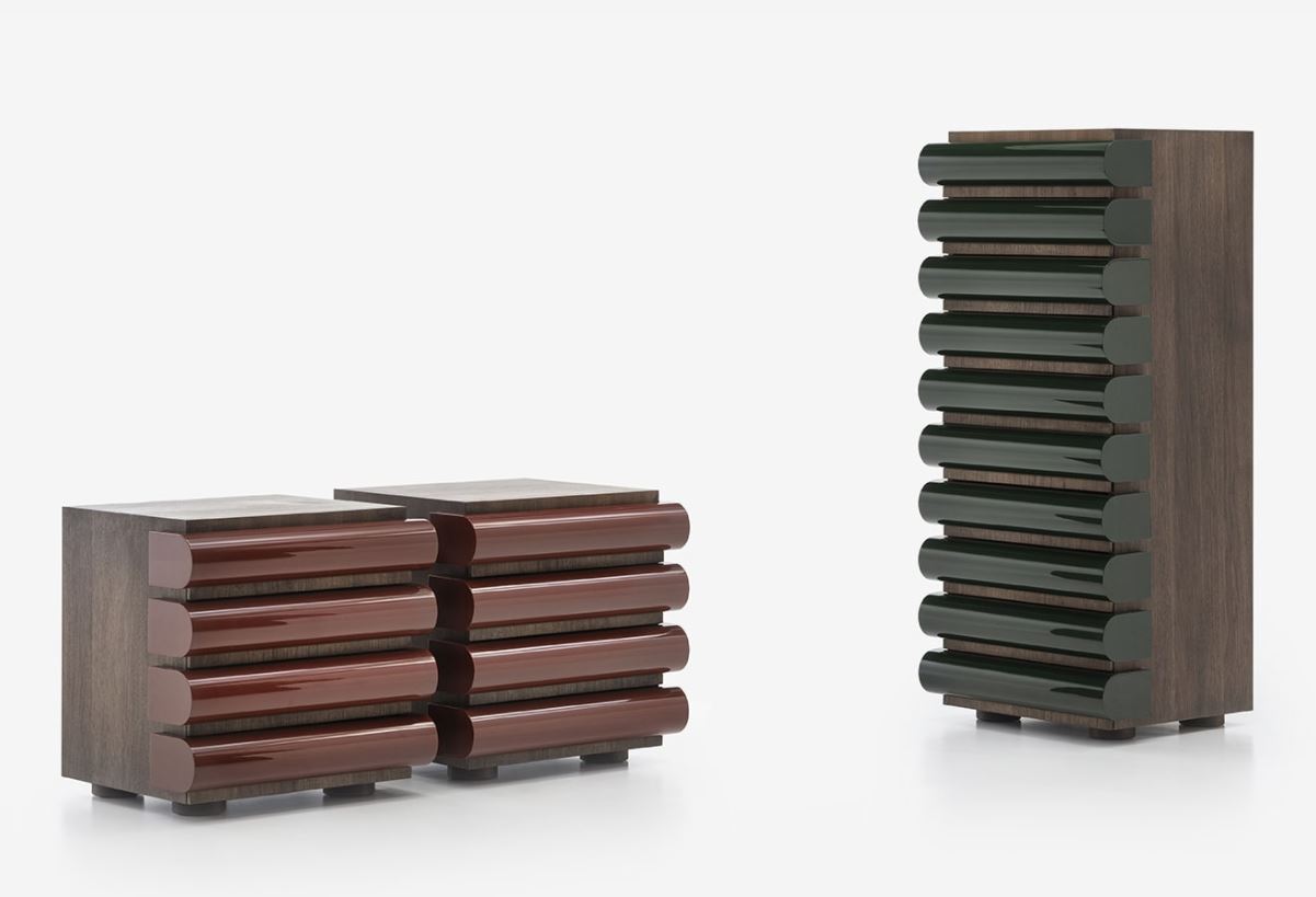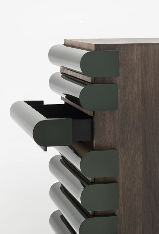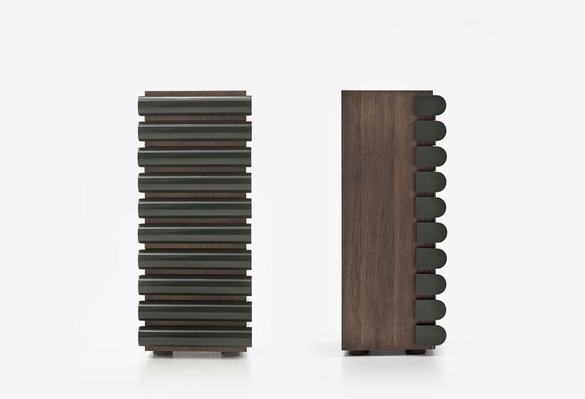 A playful, ACillar of drawers, the Storet cabinet epitomizes the visionary touch of Nanda Vigòs designs, now modernized with a brightly lacquered wood contrast and brand new proportions. In both its elongated vertical edition, and in the nightstand designed by Vigo but manufactured for the first time only now, the Storet reflects today’s advances in production, with the walnut’s visible grain illuminating Acerbis’s modern expertise in utilizing extensive wood surfaces. The cabinet, though made entirely of a single material, creates a potent game of colorplay, tempered by the pacifying shades and the natural quality of the wood.