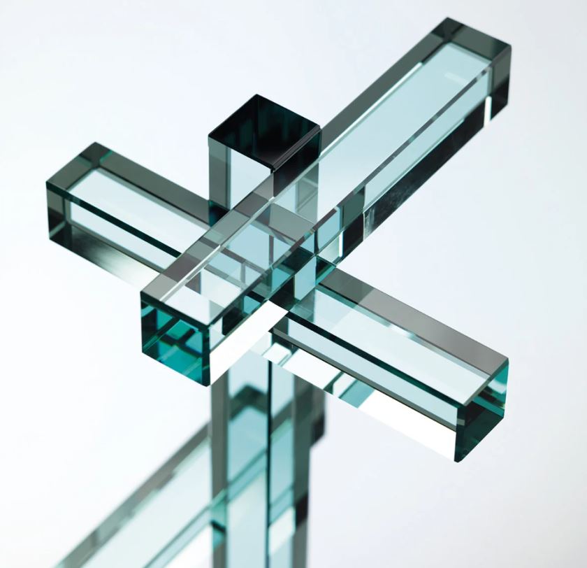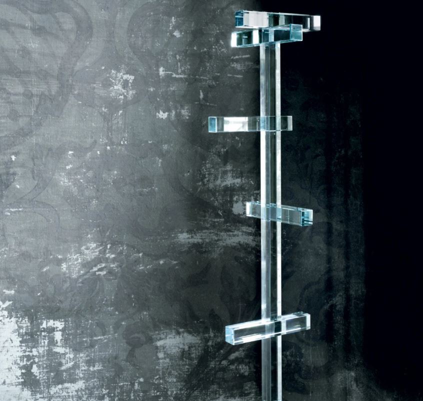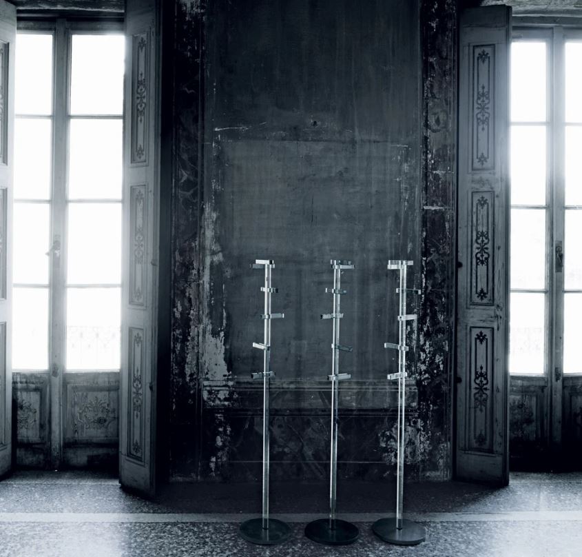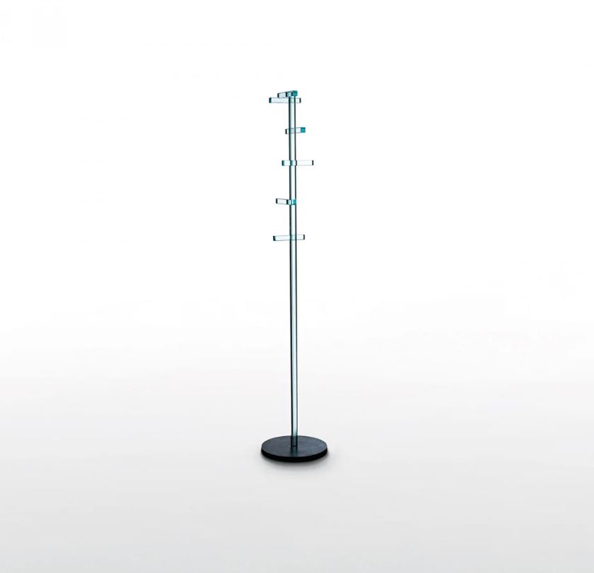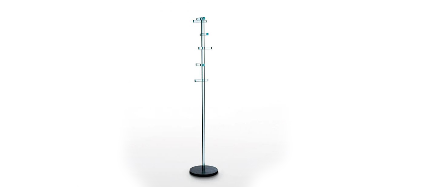 Coat stand with great lightness and formal accuracy. The stem is achieved by gluing square bars of 24 x 24 mm. thick transparent glass fixed by means of a joint system to a base made of very thick raw iron. Despite the extreme thinness of the sections, the crystal glass has a high load resistance thanks to a special tempering treatment. The rough and unfinished look of the base enhances the materiality, in contrast to the purity and the ethereal essence of the glass stem.