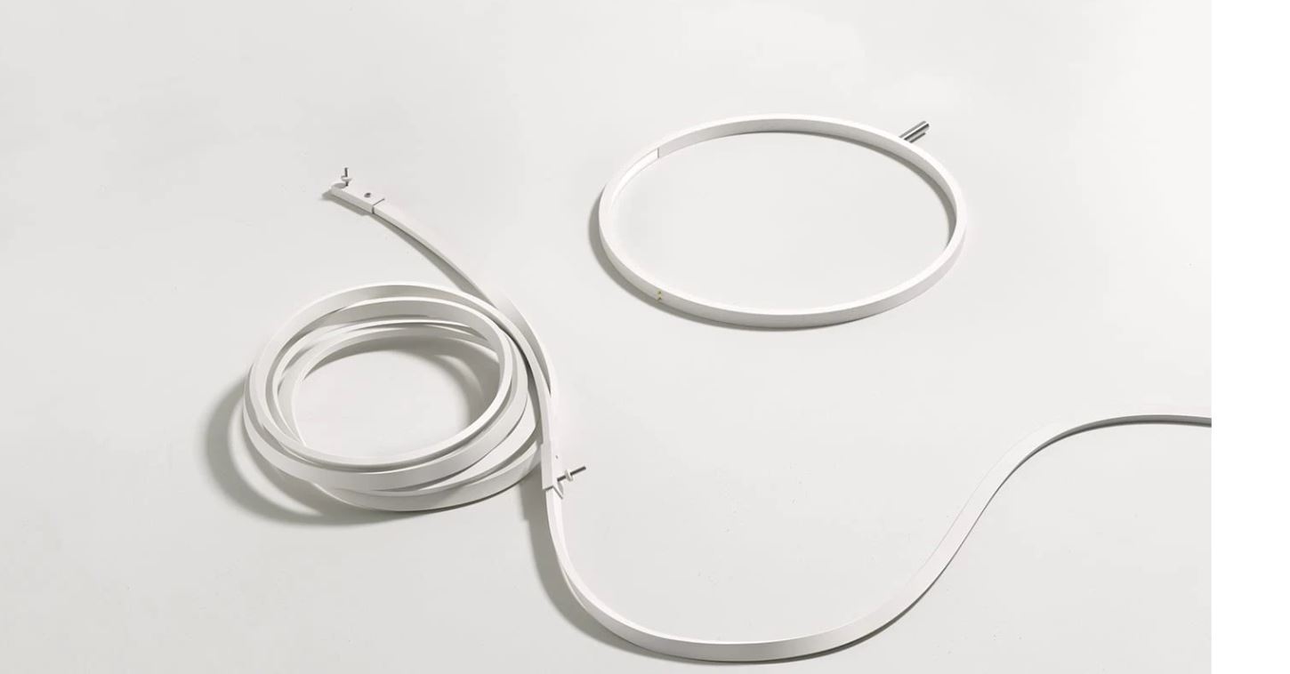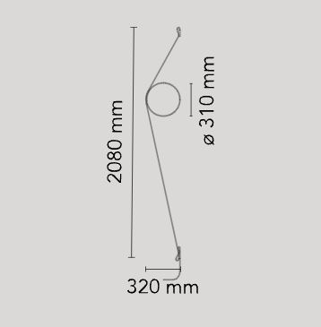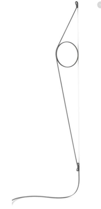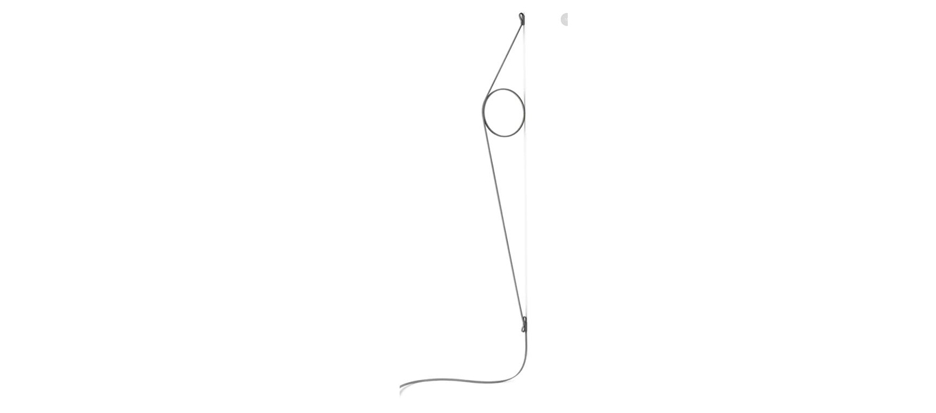 Indirect light wall lighting device with body in calendered, extruded aluminium with galvanised or varnished finish. The special tangent cable, in coloured rubber, provides the power. The cable is fixed to the wall with ABS joints in the same finish as the ring. Dimming via switch pedal on the cable. Power supply on adapter with interchangeable plugs. Useful cable length is 2.5 metres.