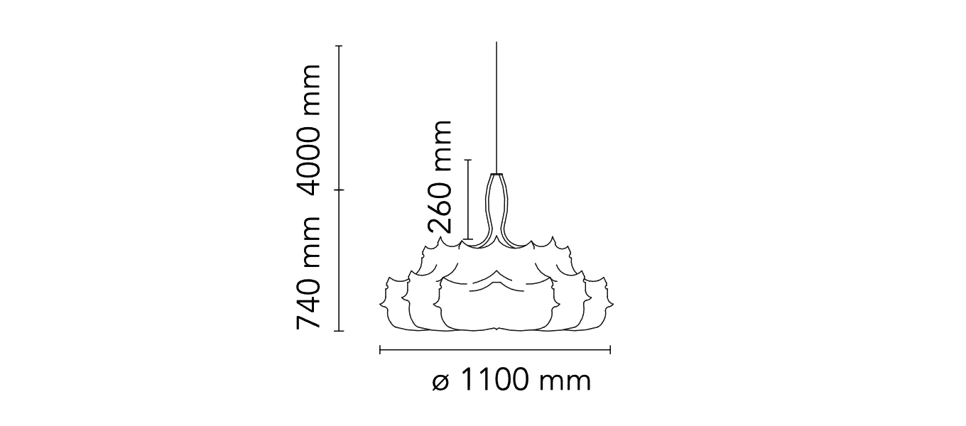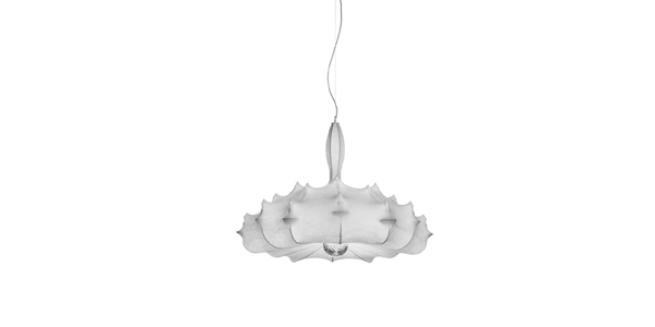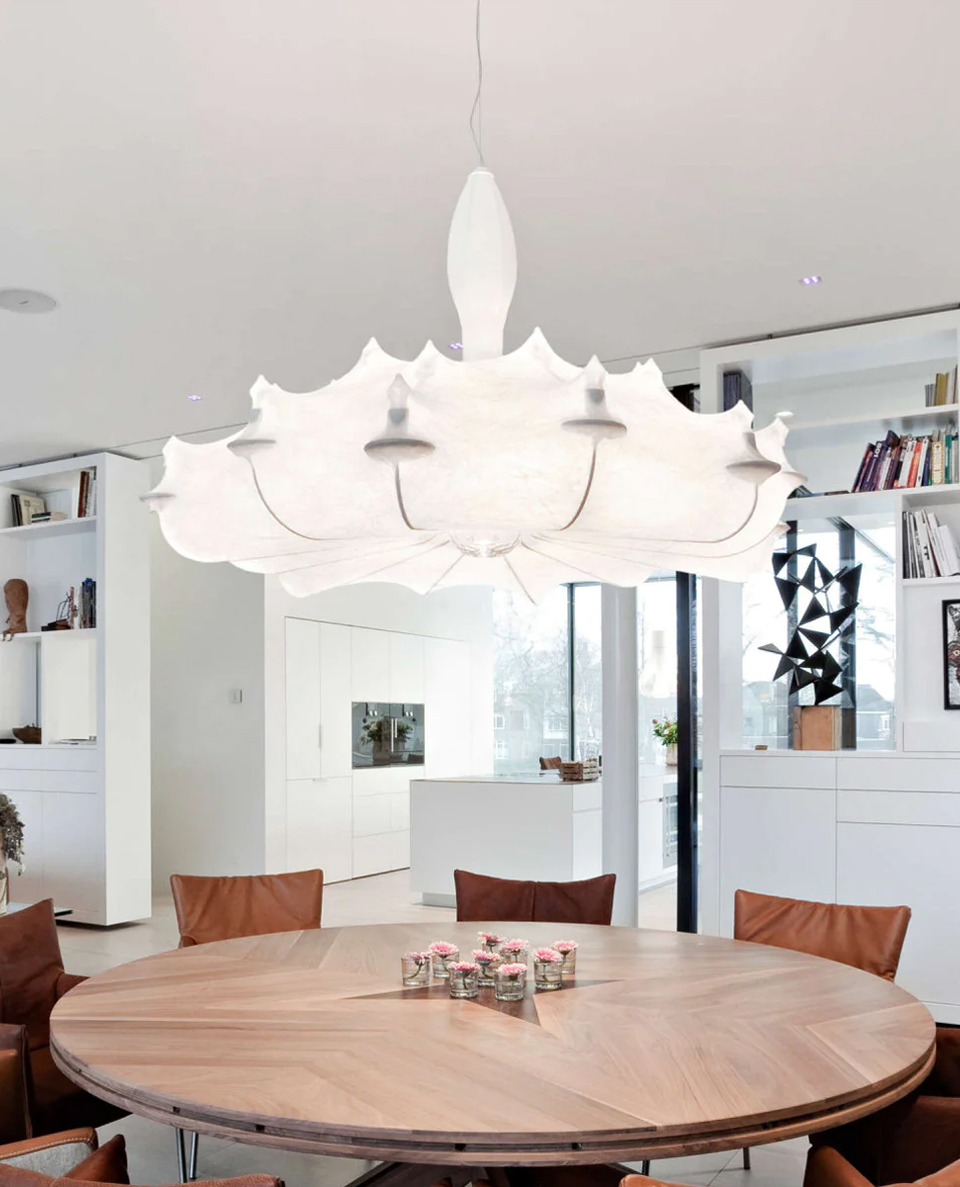 Suspension lamp providing diffused lighting. White powder coated internal steel structure sprayed with a unique “cocoon resin to create the diffuser which is then protected by a transparent sprayed on finish. Transparent polymethylmethacrylate (PMMA) “candles. Faceted crystal globe located at the lower center for a sparkle effect.